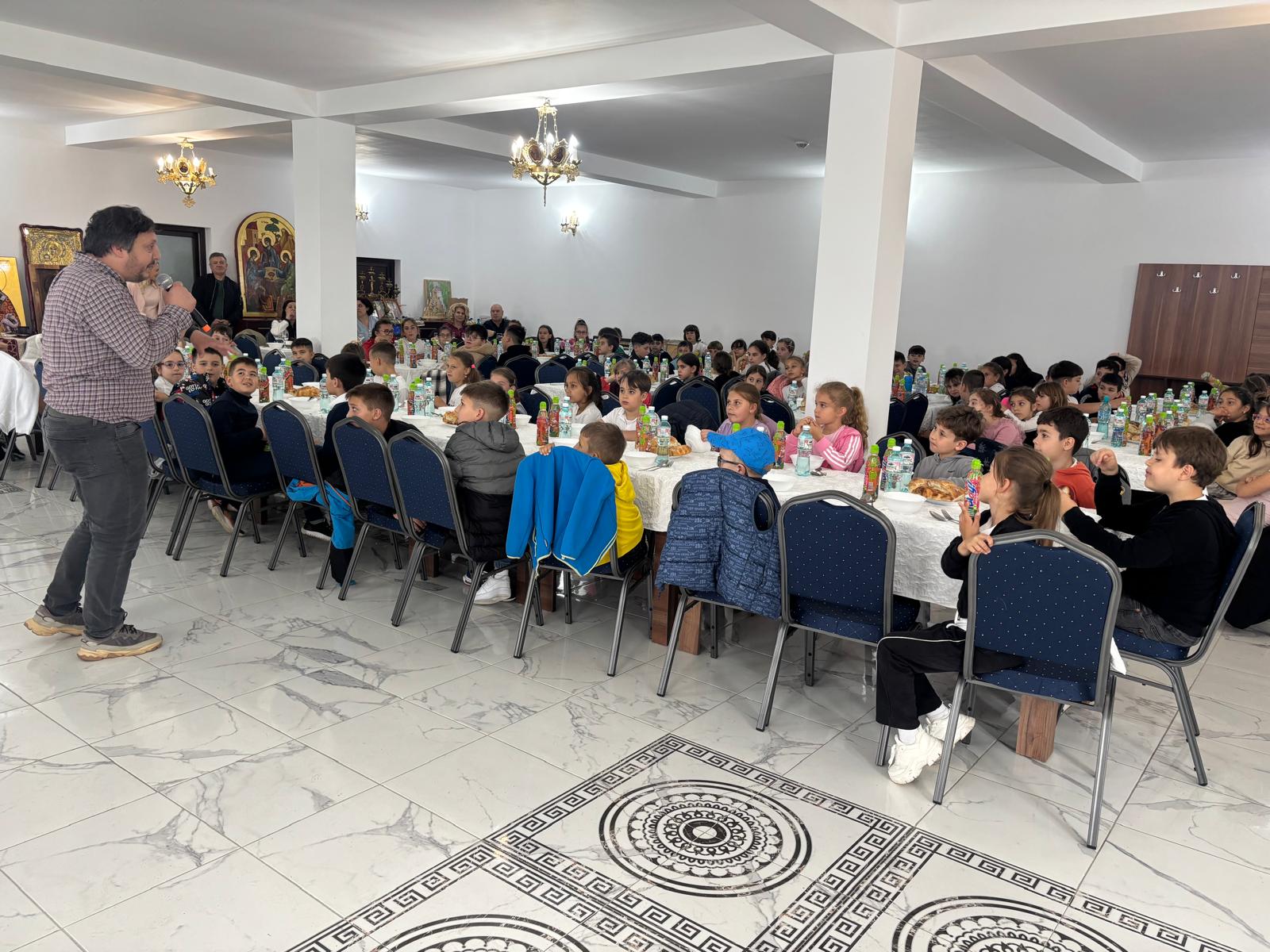 Părintele slujitor Bologea Cosmin Vasile a primit vizita de 130 de copii din parohie și din zonele învecinate, care s-au bucurat de programul oferit: masă caldă, dulciuri și interacționare cu actorii de la Teatrul Sică Alexandrescu din Brașov.