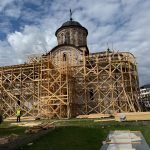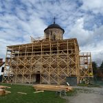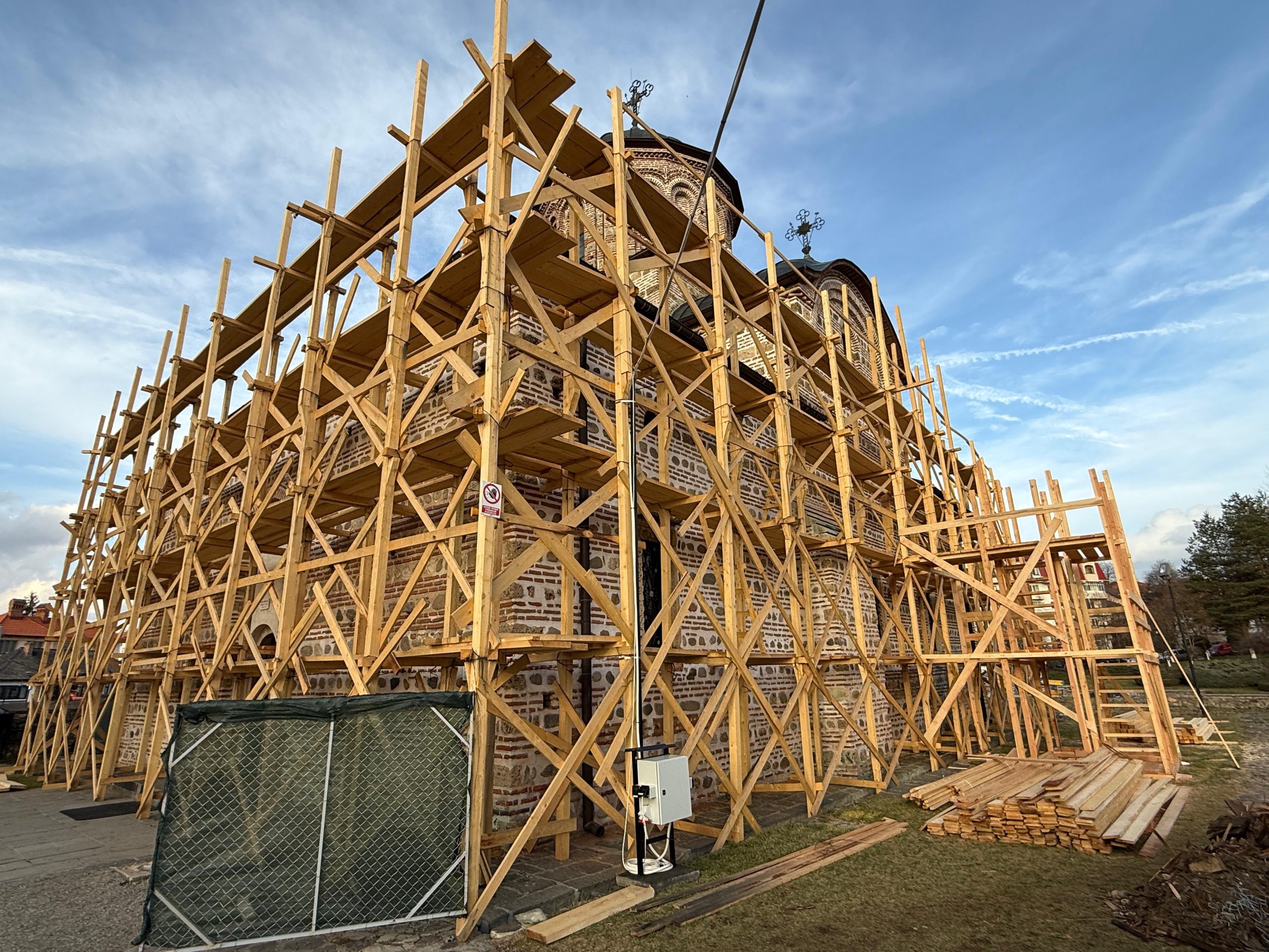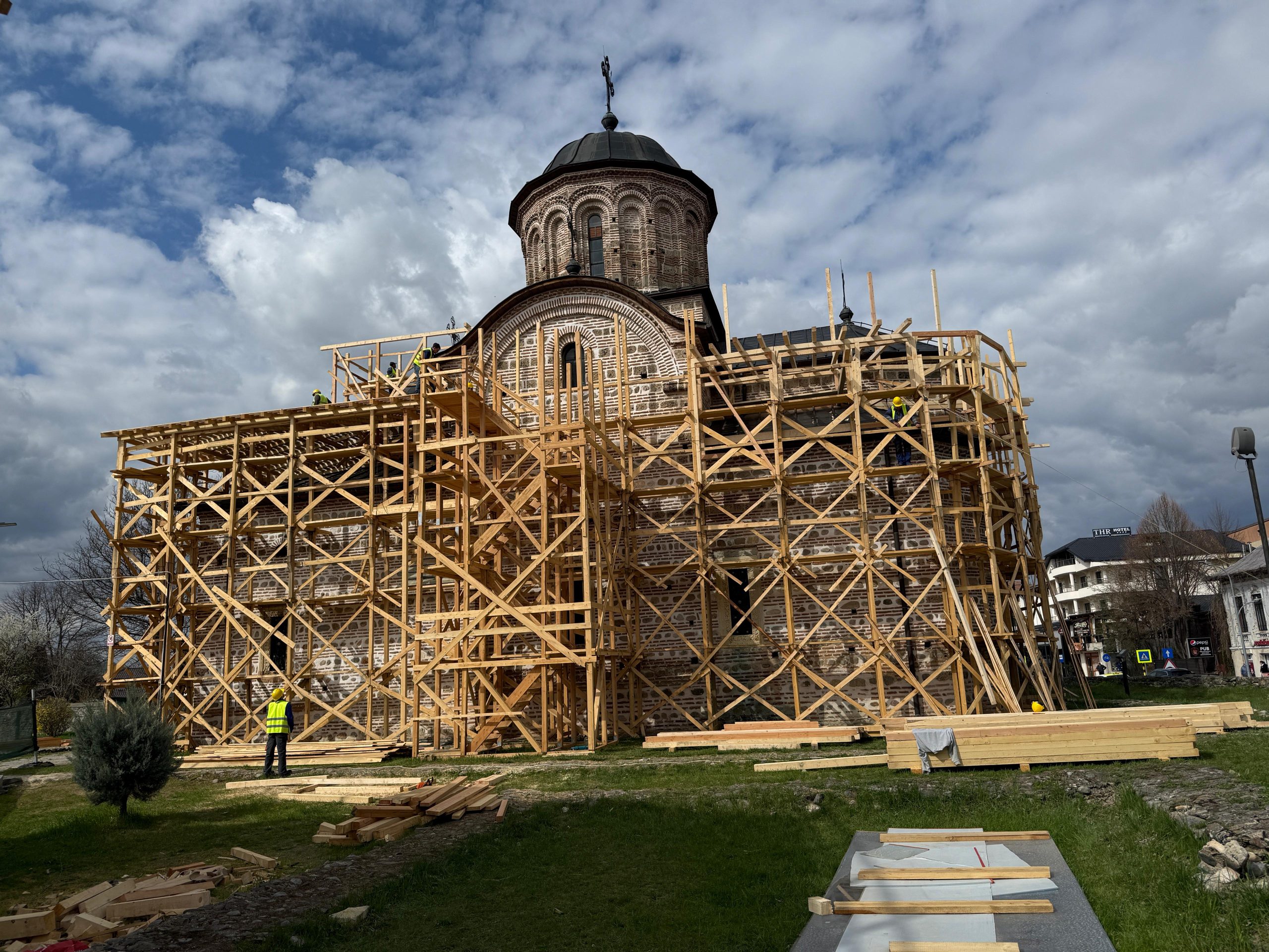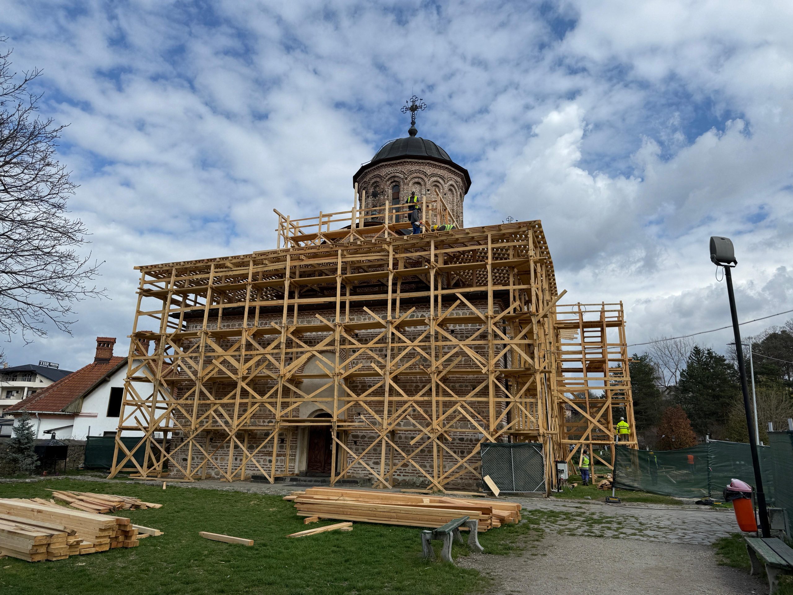 În prezent sunt montate schelele de lemn atât pe biserică, cât și pe turnul clopotniță, iar zeci de muncitori lucrează în ambele zone, profitând și de vremea foarte bună.