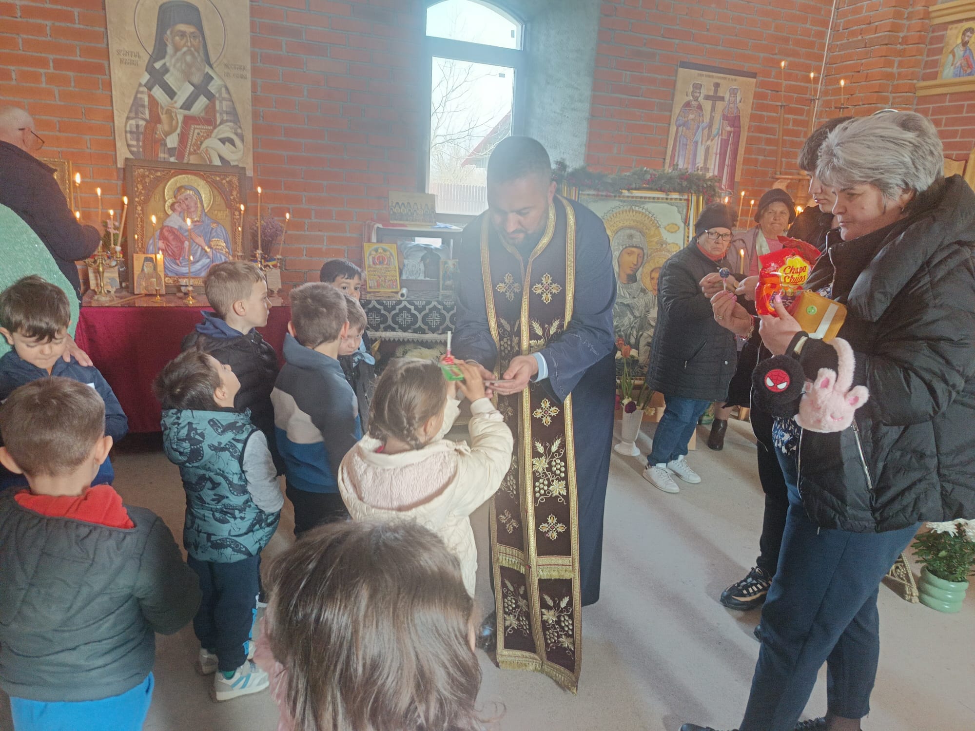Părintele slujitor Ștefan Viorel a primit vizita copiilor de la grădinița din localitate, coordonați de doamna educator Fiță Emilia. După cuvântul catehetic, copiii au fost împărtășiți și au primit daruri.