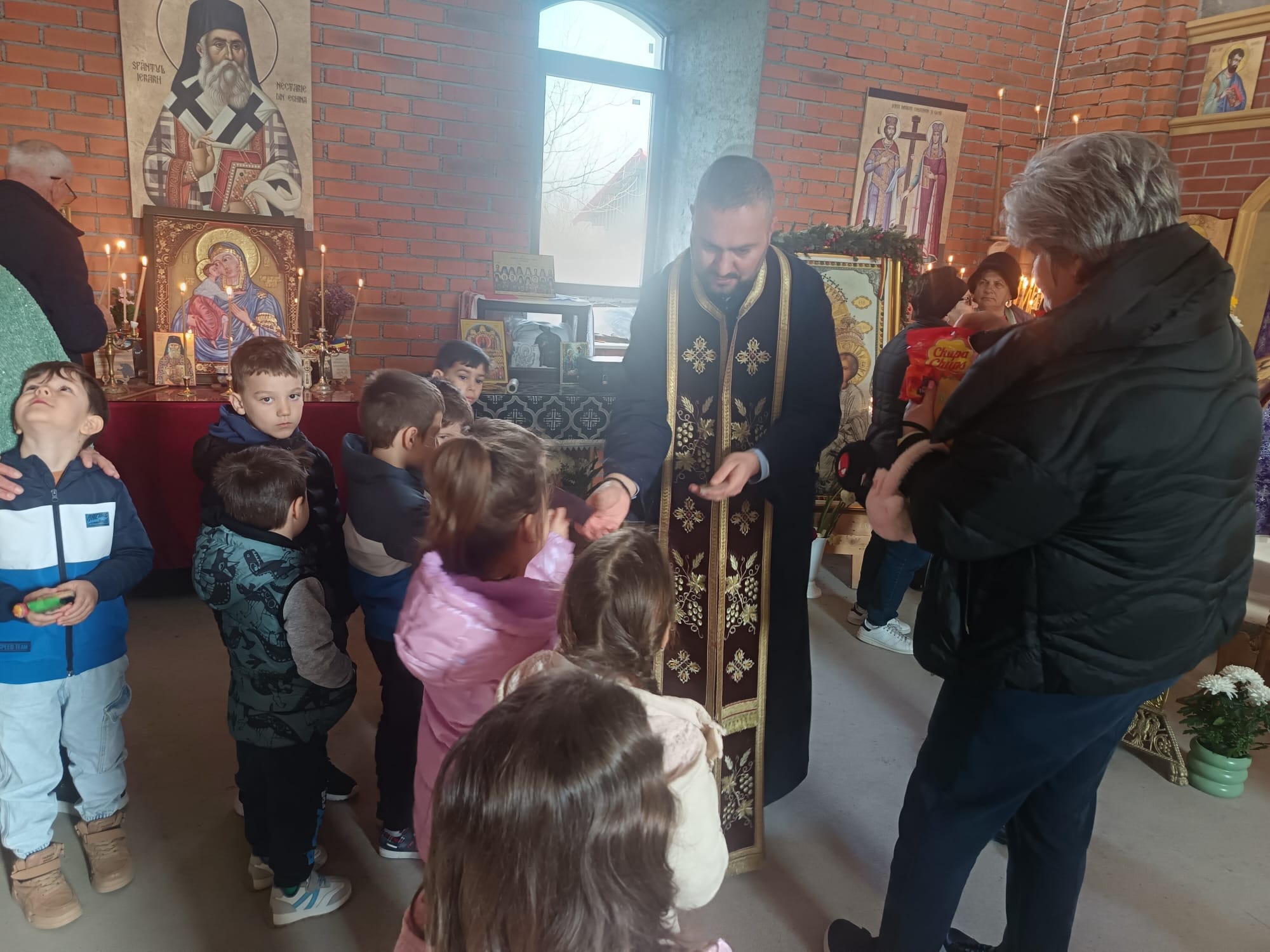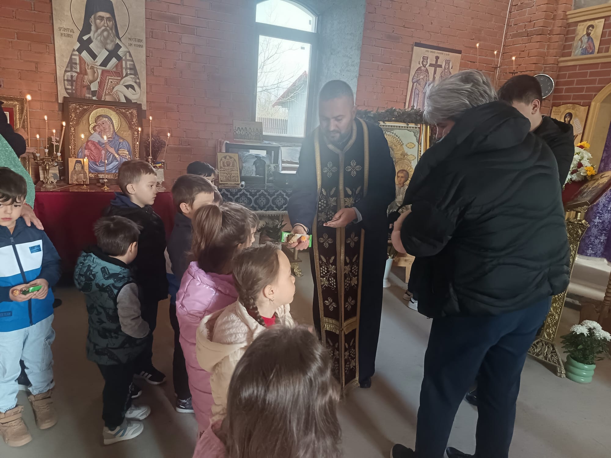 Părintele slujitor Ștefan Viorel a primit vizita copiilor de la grădinița din localitate, coordonați de doamna educator Fiță Emilia. După cuvântul catehetic, copiii au fost împărtășiți și au primit daruri.