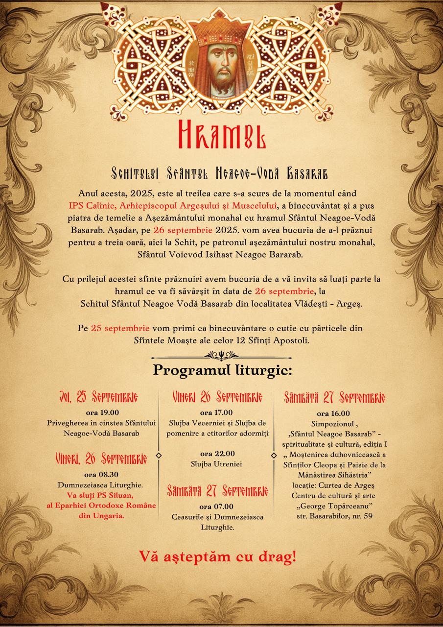 Cu binecuvântarea Înaltpreasfințitului Părinte Calinic Argeșeanul, Arhiepiscopia Argeșului și Muscelului prin Schitul Sfântul Neagoe Vodă Basarab – Vlădești, organizează sâmbătă, 27 septembrie, ora 16.00, la Centrul de Cultură și Arte „George Topârceanu” din…