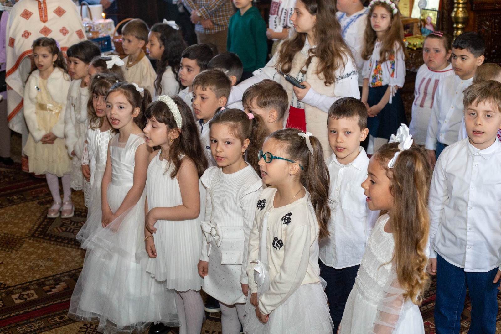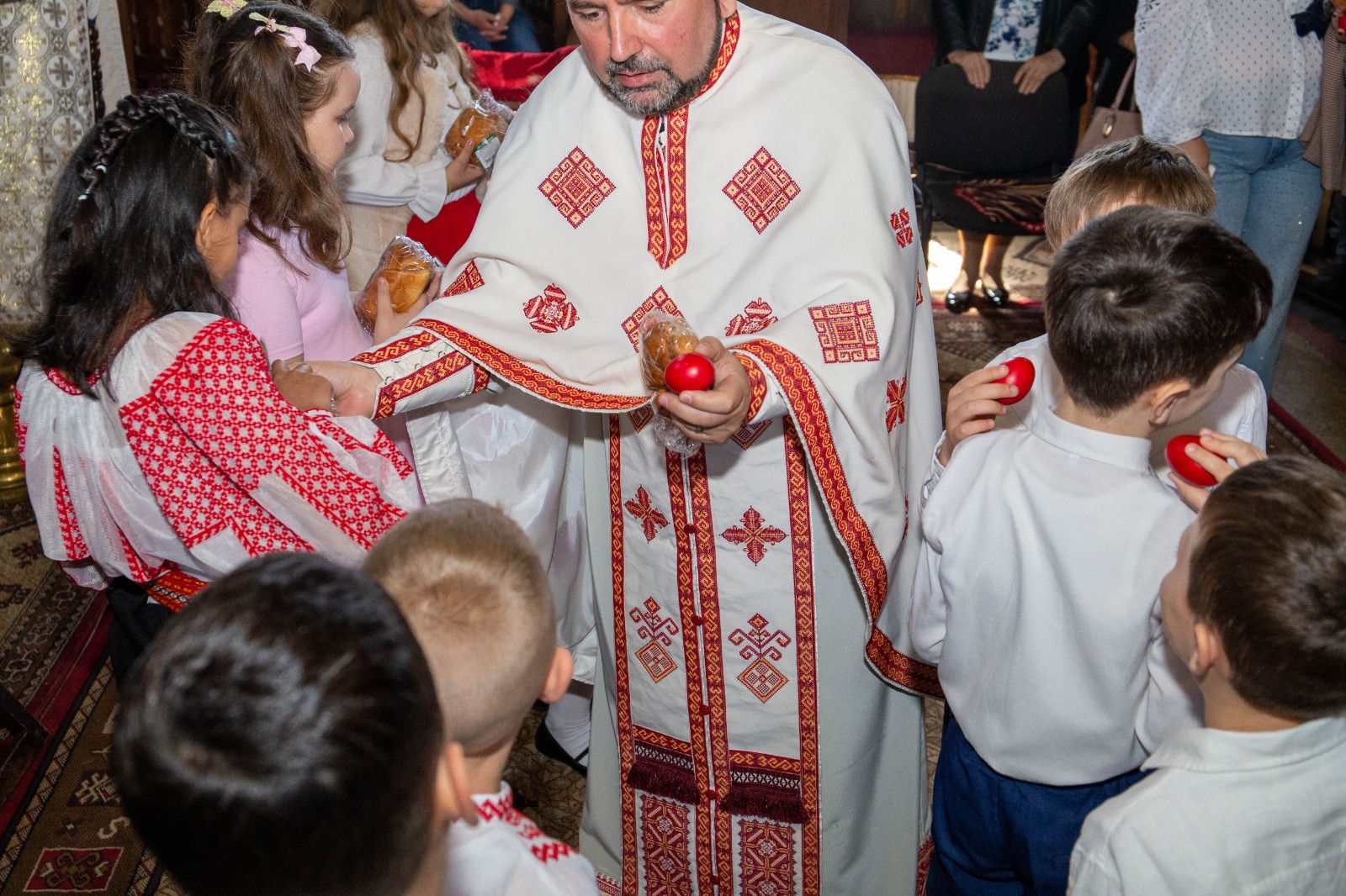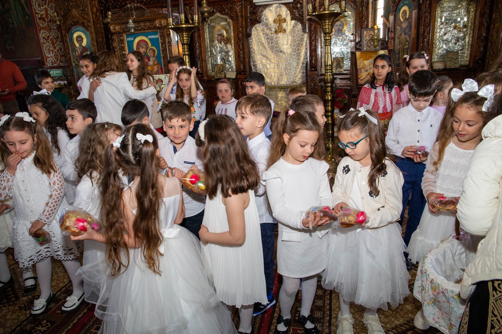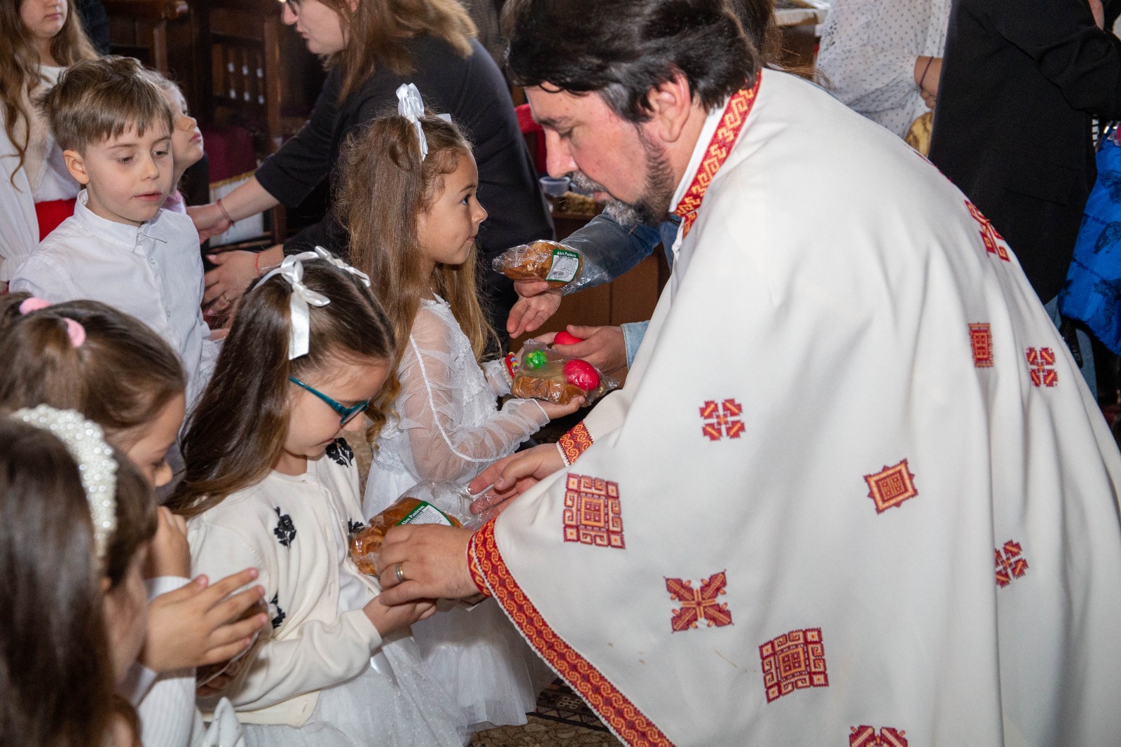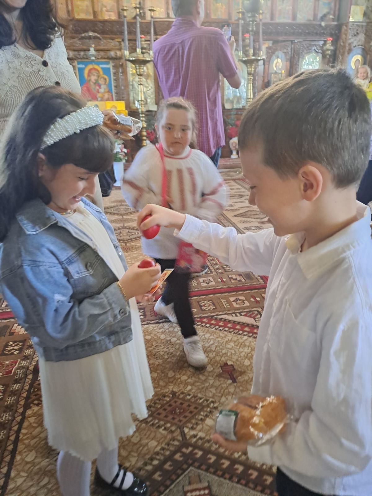 La sfârșit, preotul slujitor le-a vorbit copiilor despre însemnătatea Praznicului Învierii Domnului și a oferit din partea parohiei ouă roșii și pască.