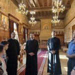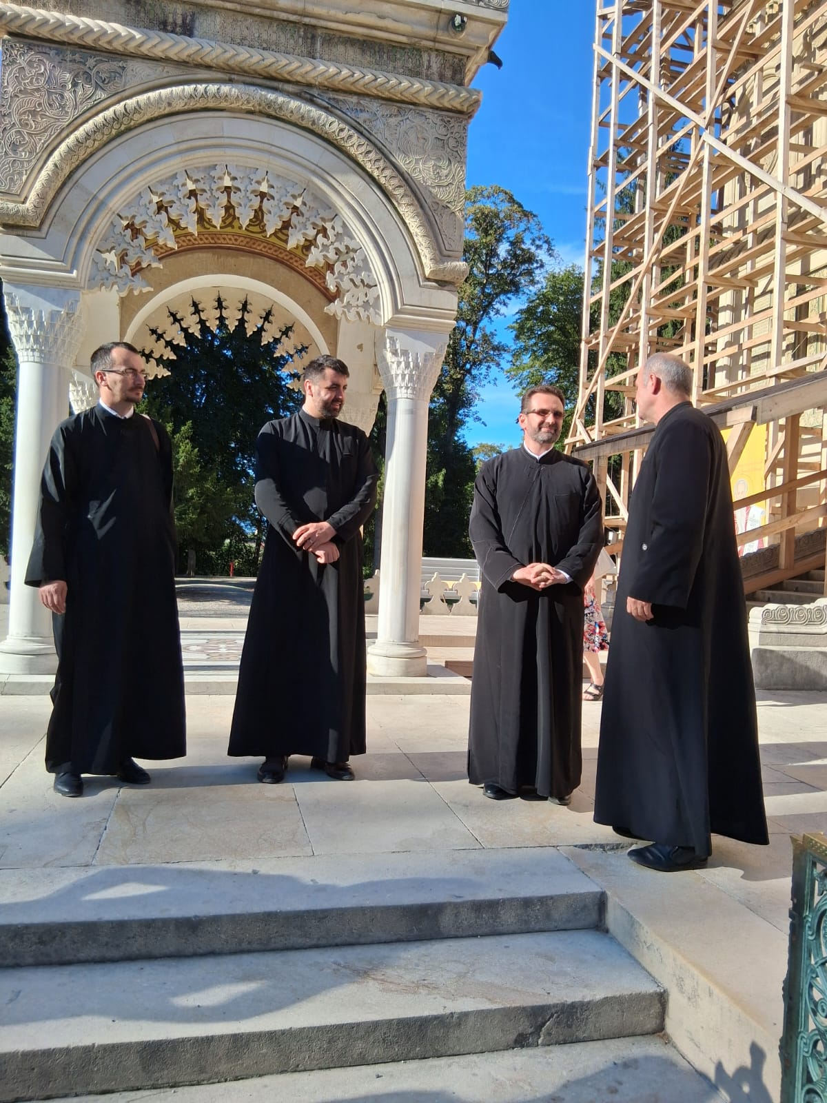 Părintele Adrian Enache i-a întâmpinat pe oaspeți în fața Catedralei istorice a Sfântului Voievod Neagoe Basarab, unde le-a prezentat aspecte din istoria quicentenară a faimosului monument, care se află într-un amplu proces de restaurare.