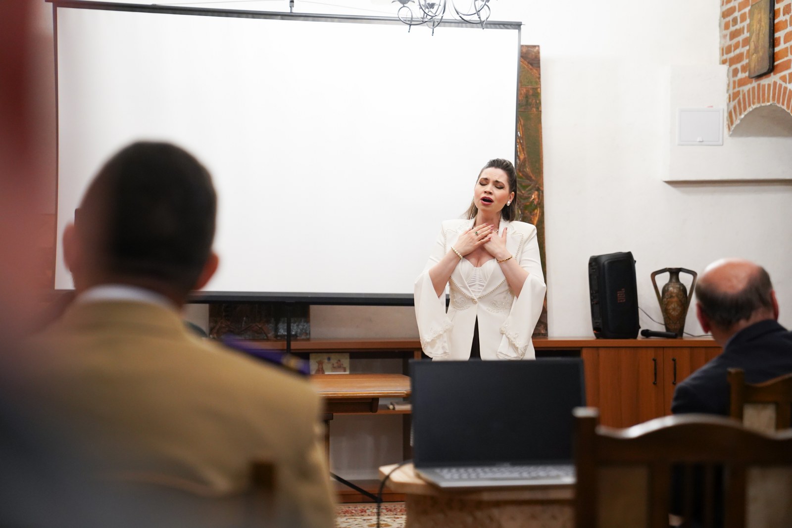 Moderatorul evenimentului, domnul George Grigoriu, a prezentat-o pe soprana Elina Velica, a cărei voce a încântat pe cei prezenți, prin frumosul popas muzical, pe care l-a oferit.