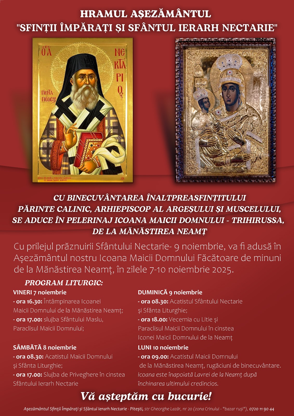 Cu binecuvântarea Părintelui Arhiepiscop Calinic Argeșeanul, în perioada 7-10 noiembrie 2025, la Așezământul Sfinții Împărați și Sfântul Ierarh Nectarie din municipiul Pitești, va fi adusă, în pelerinaj, Icoana Maicii Domnului, Făcătoare de Minuni, de la Mănăstirea Neamț.