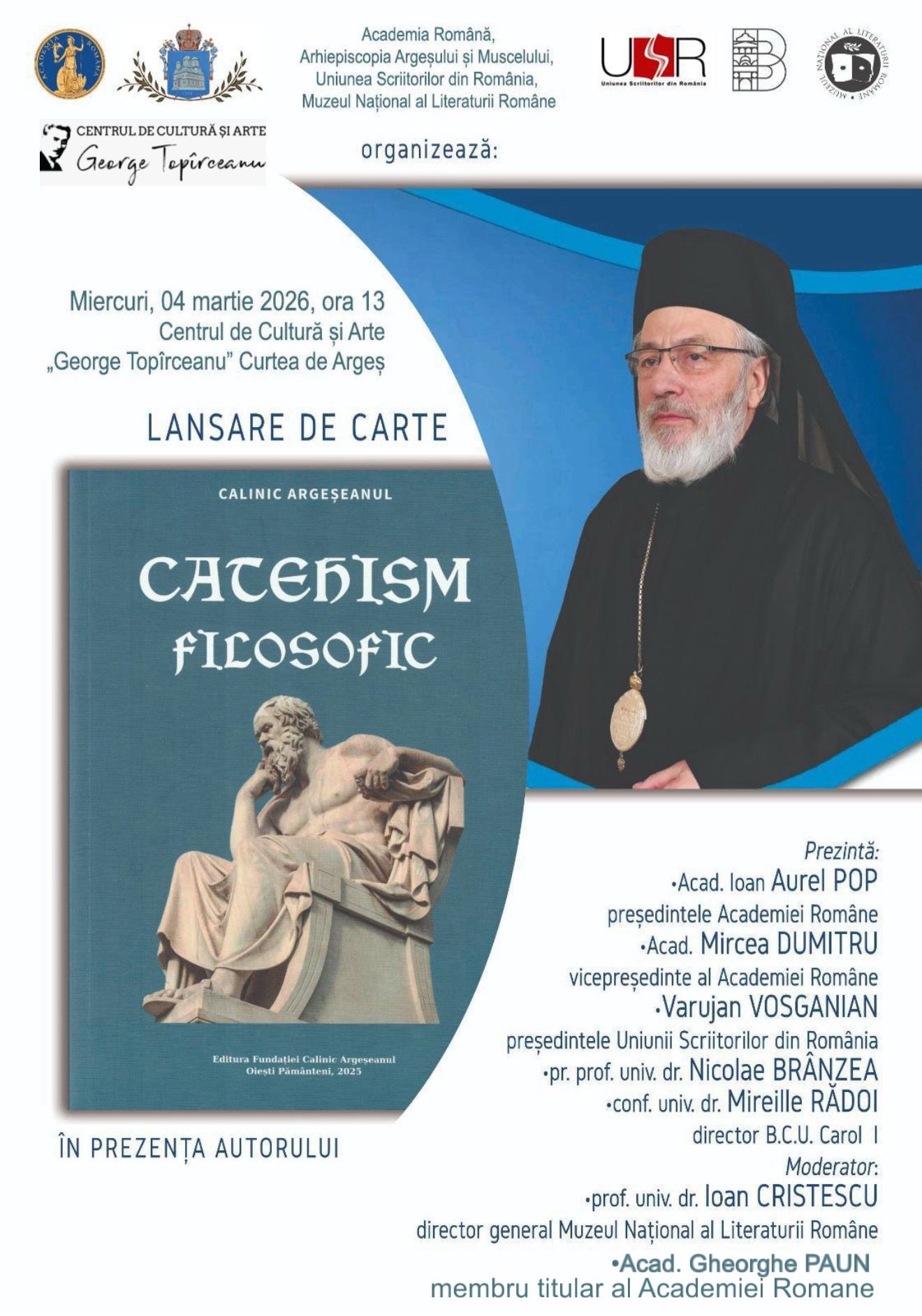 Cu binecuvântarea Înaltpreasfințitului Părinte Calinic Argeșeanul, Academia Română, Arhiepiscopia Argeșului și Muscelului, Uniunea Scriitorilor din România și Muzeul Național al Literaturii Române, organizează MIERCURI, 4 MARTIE 2026, ORA 13, la Centrul de Cultură și Arte „George Topârceanu” din municipiul Curtea de Argeș: LANSARE DE CARTE: CATEHISM FILOSOFIC, în prezența autorului.