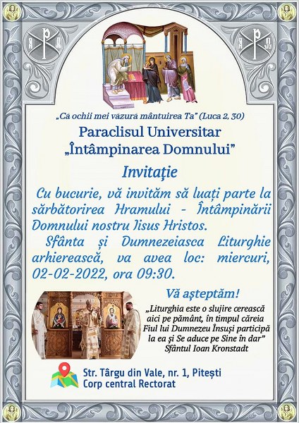Miercuri, 2 februarie 2022, Paraclisul Universitar din Pitești își va sărbători hramul!