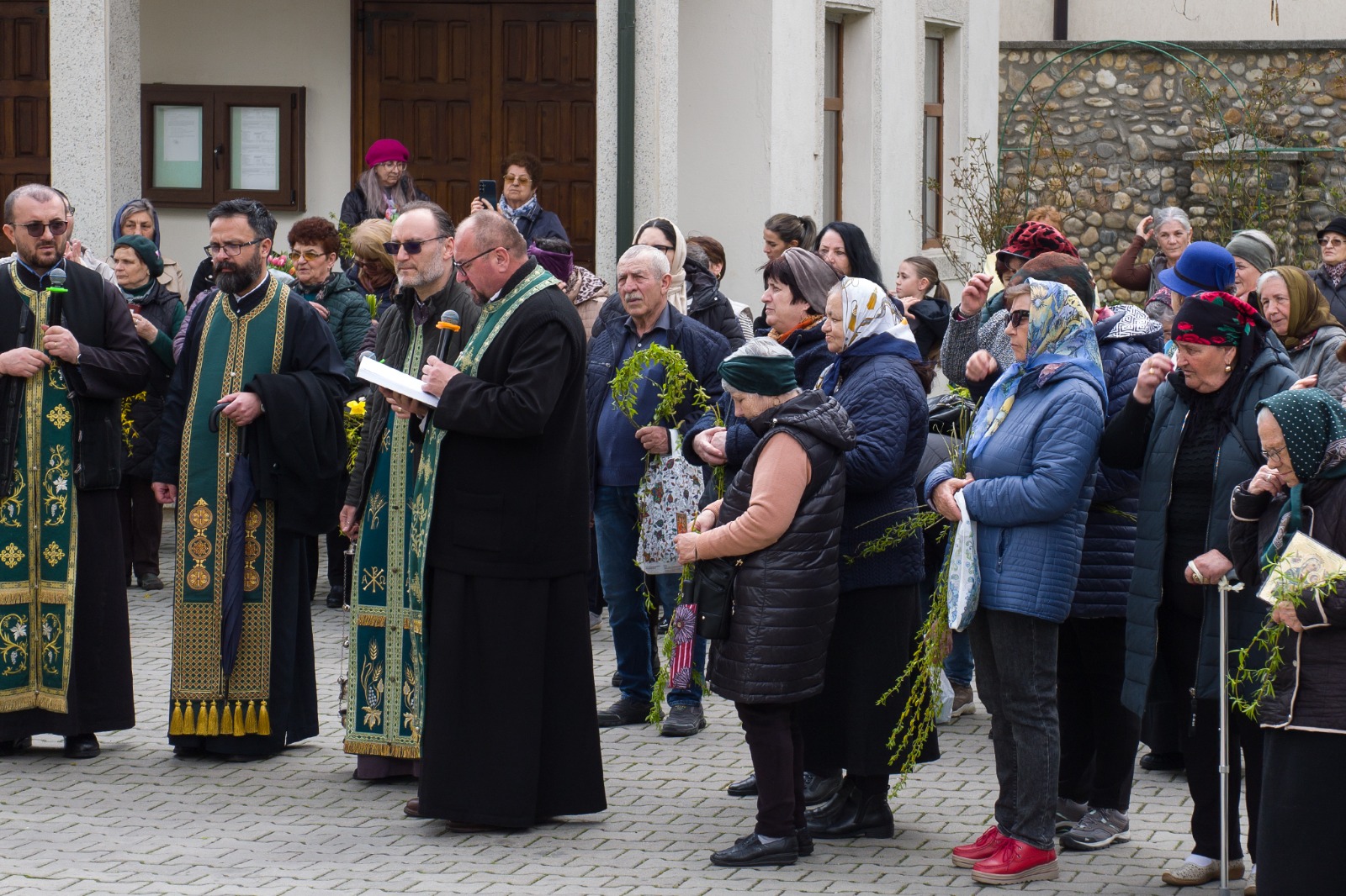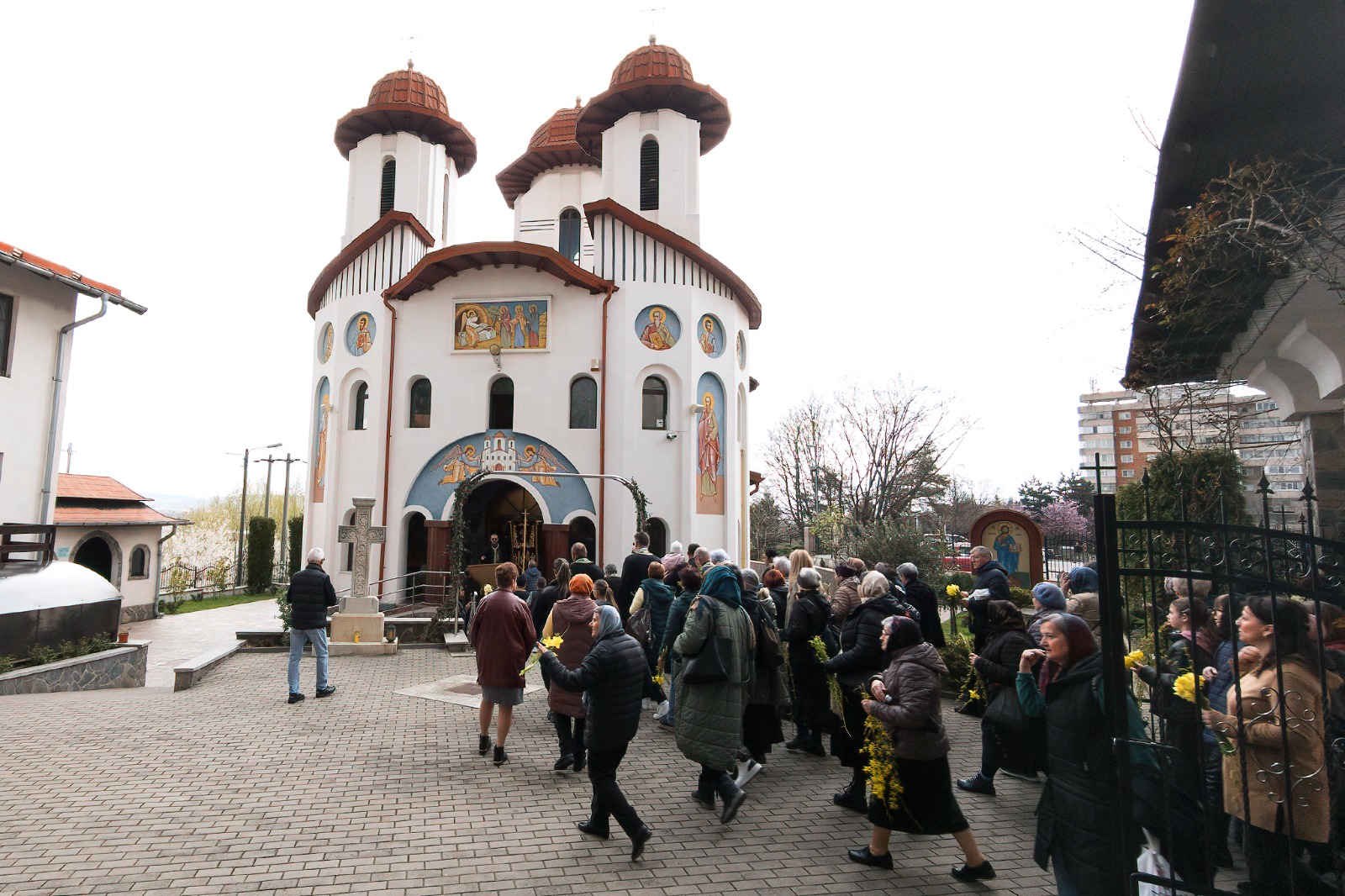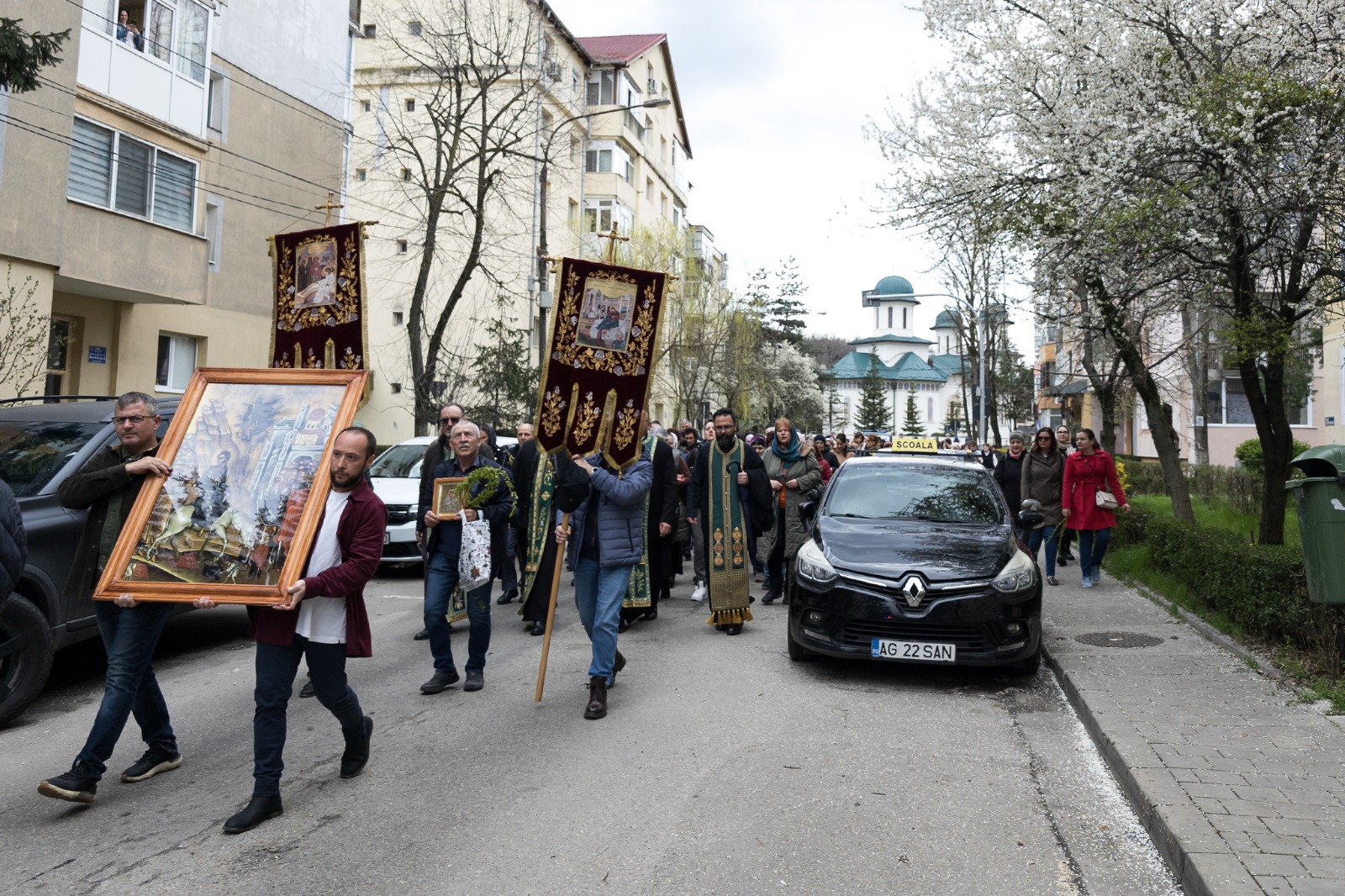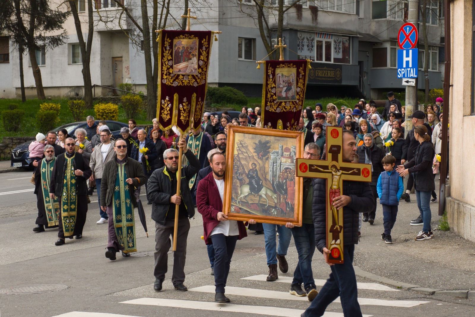 În sunet de clopot și toacă, având în față Icoana Praznicului Floriilor, cu prapori și ramuri de salcie și în cântări specifice perioadei Postului Mare, s-a pornit apoi pe Bulevardul 1 Decembrie 1918, spre Biserica Sfântul Mare Mucenic Pantelimon- Spitalul Județean, unde preoții au rostit o ectenie spre Slava lui Dumnezeu și binecuvântarea credincioșilor aflați la procesiune. Traseul a continuat apoi prin mijlocul cartierului Găvana III, și s-a încheiat la biserica parohiei Găvana IV, unde s-a săvârșit slujba Vecerniei Floriilor.