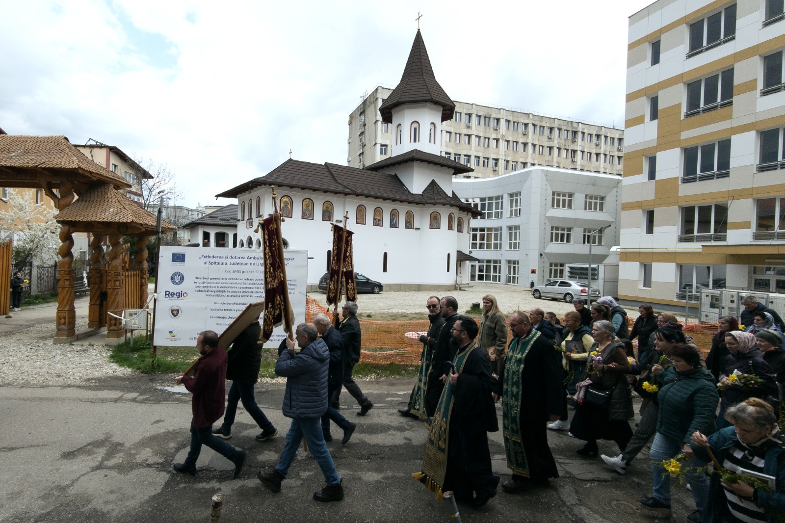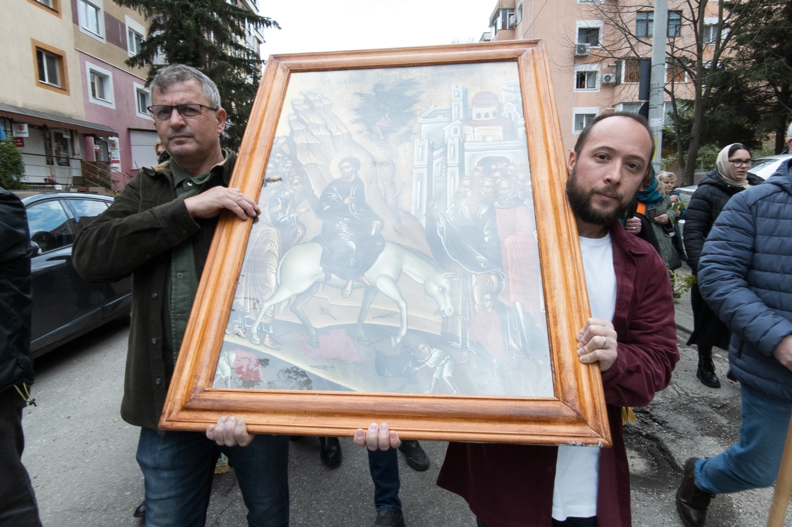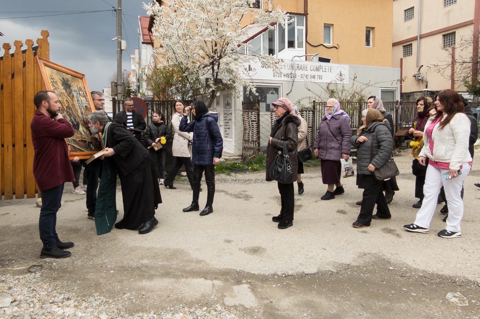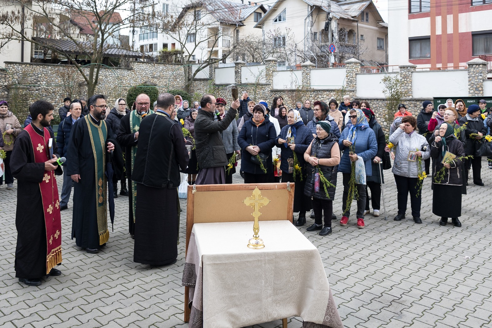 În sunet de clopot și toacă, având în față Icoana Praznicului Floriilor, cu prapori și ramuri de salcie și în cântări specifice perioadei Postului Mare, s-a pornit apoi pe Bulevardul 1 Decembrie 1918, spre Biserica Sfântul Mare Mucenic Pantelimon- Spitalul Județean, unde preoții au rostit o ectenie spre Slava lui Dumnezeu și binecuvântarea credincioșilor aflați la procesiune. Traseul a continuat apoi prin mijlocul cartierului Găvana III, și s-a încheiat la biserica parohiei Găvana IV, unde s-a săvârșit slujba Vecerniei Floriilor.