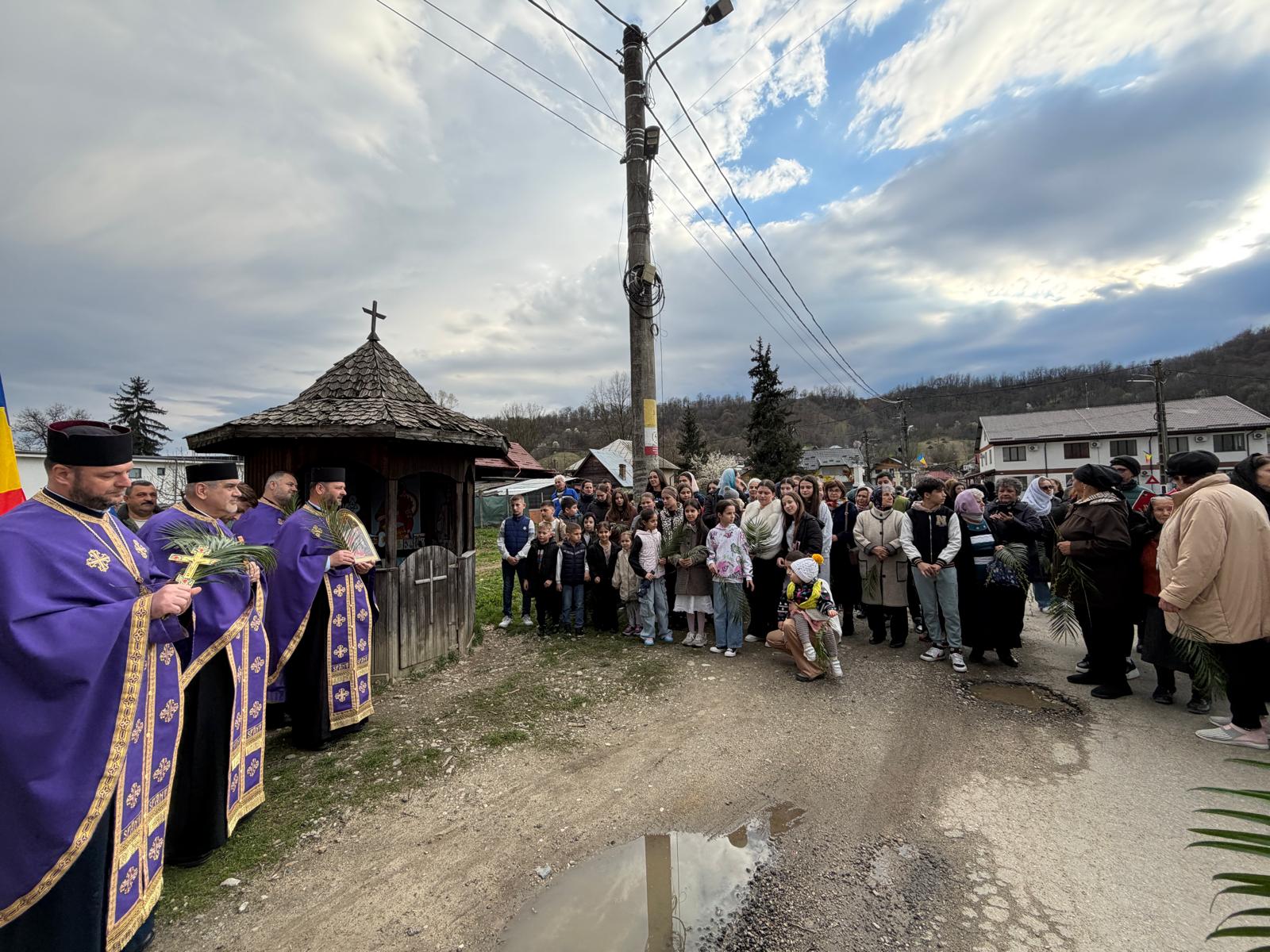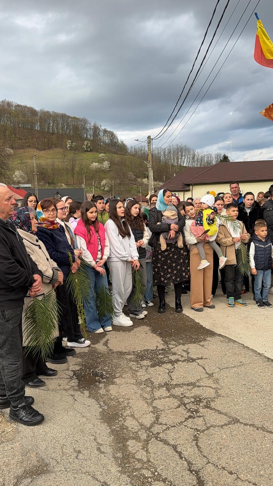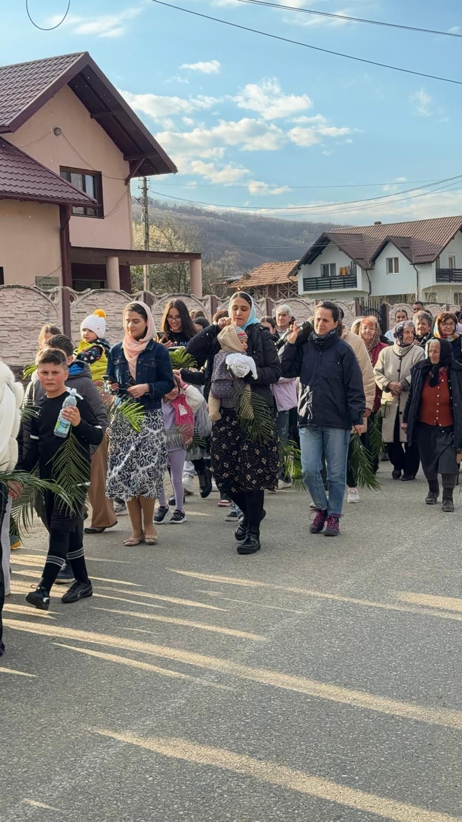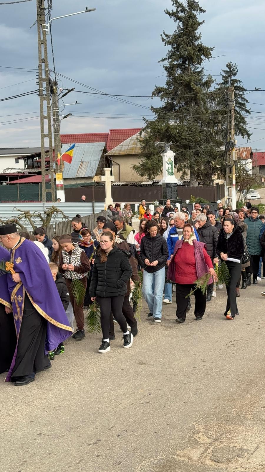 Preoții slujitori Robert Stan și Florin Păcioianu, înconjurați de numeroși credincioși au pornit cu ramuri de finic în mână și cântări bisericești, pornind de la o troiță reprezentativă a comunității către biserica parohială, unde au săvârșit slujba de seară.