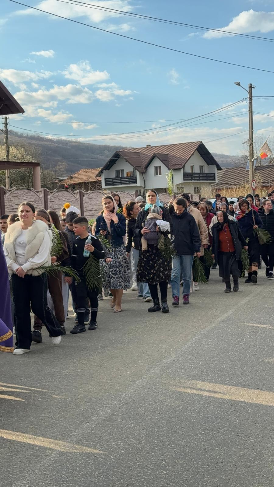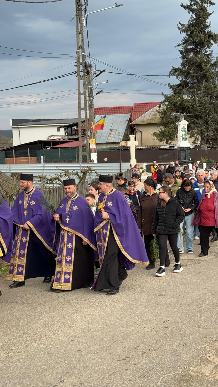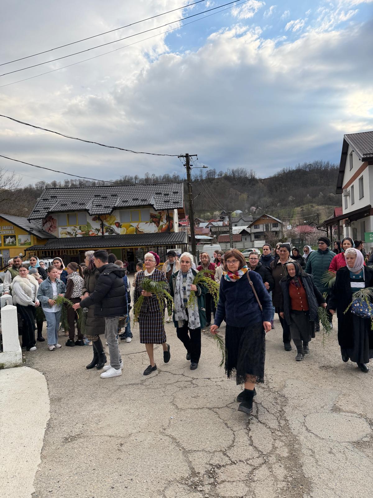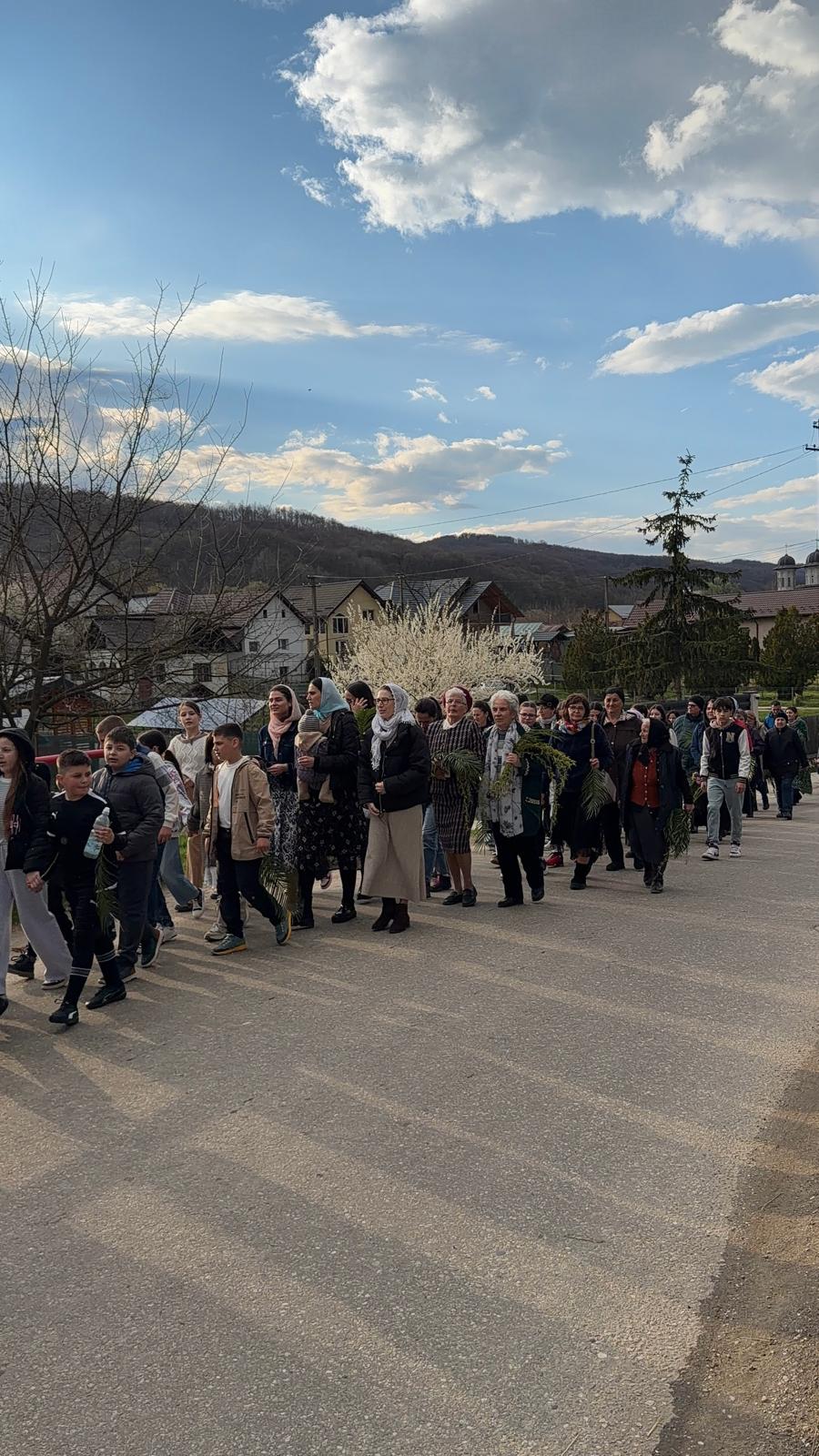 Preoții slujitori Robert Stan și Florin Păcioianu, înconjurați de numeroși credincioși au pornit cu ramuri de finic în mână și cântări bisericești, pornind de la o troiță reprezentativă a comunității către biserica parohială, unde au săvârșit slujba de seară.