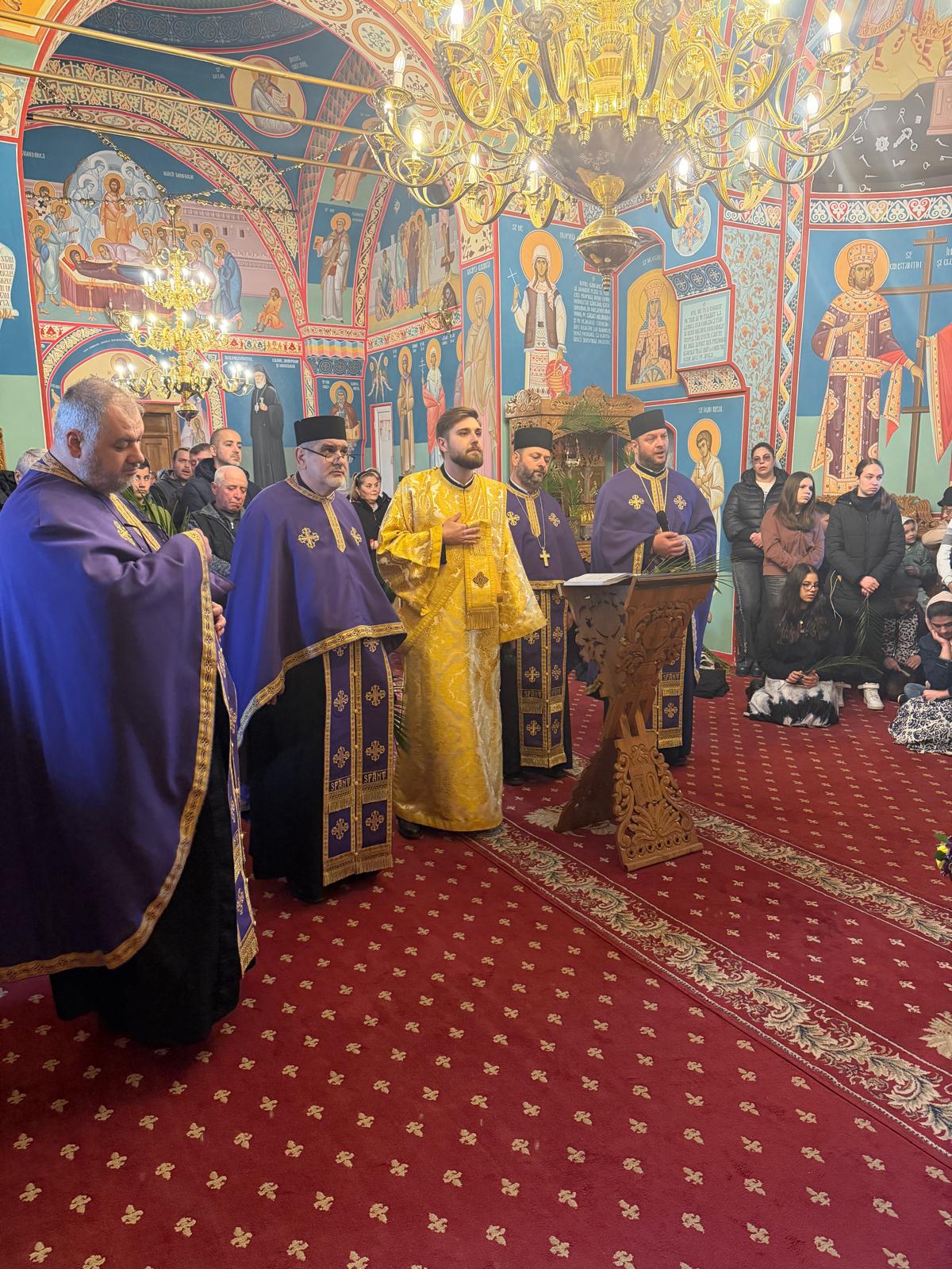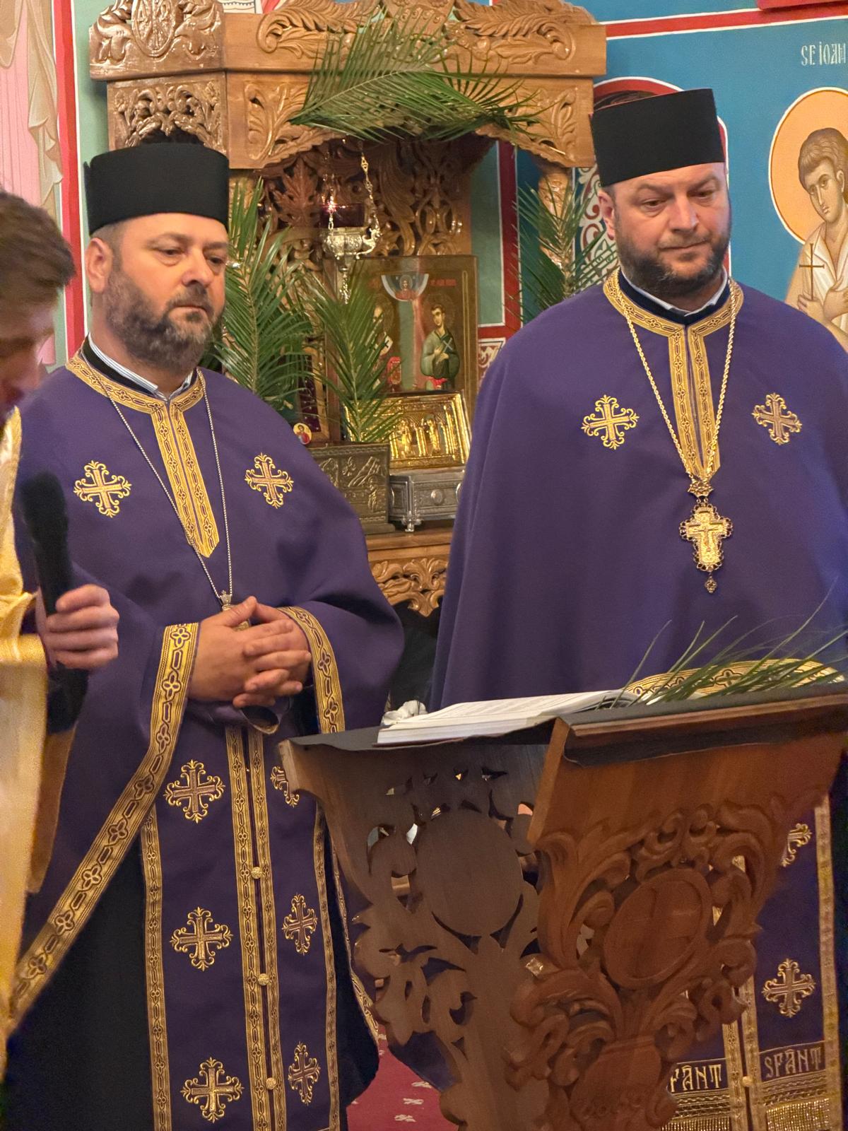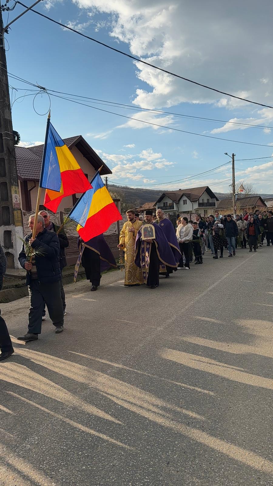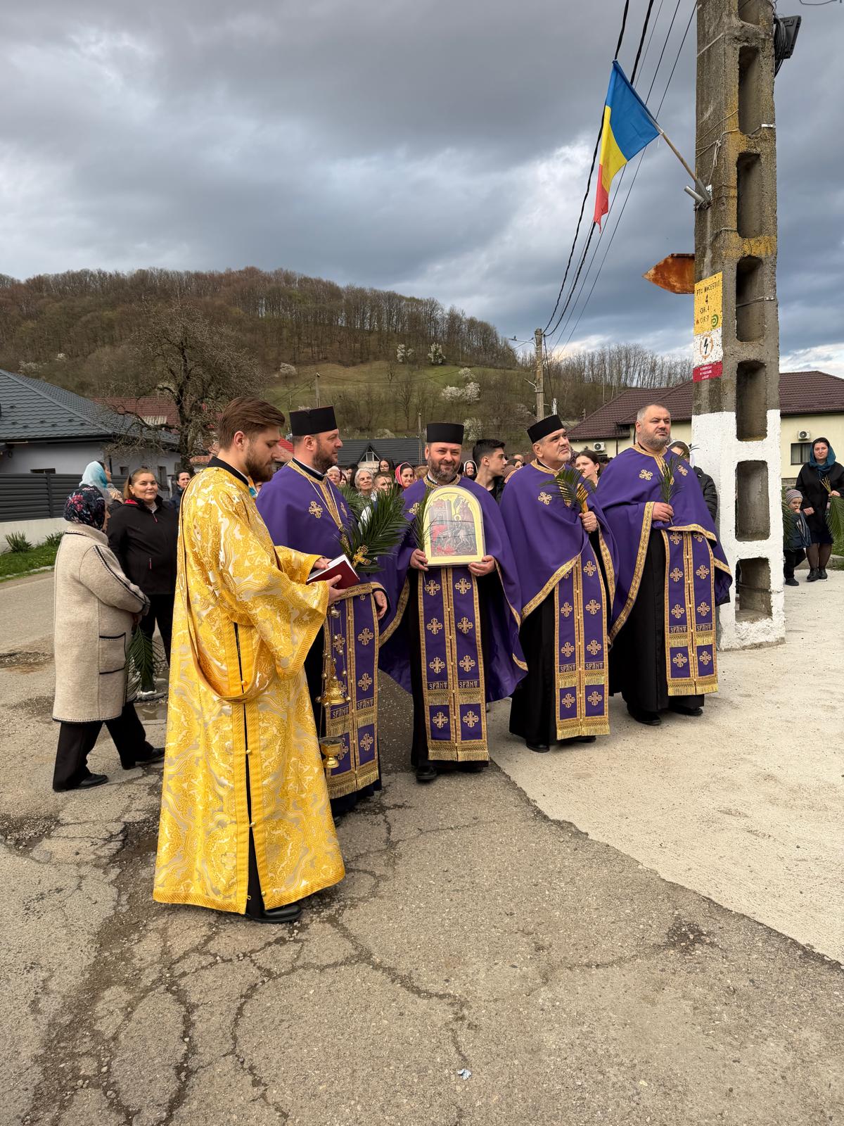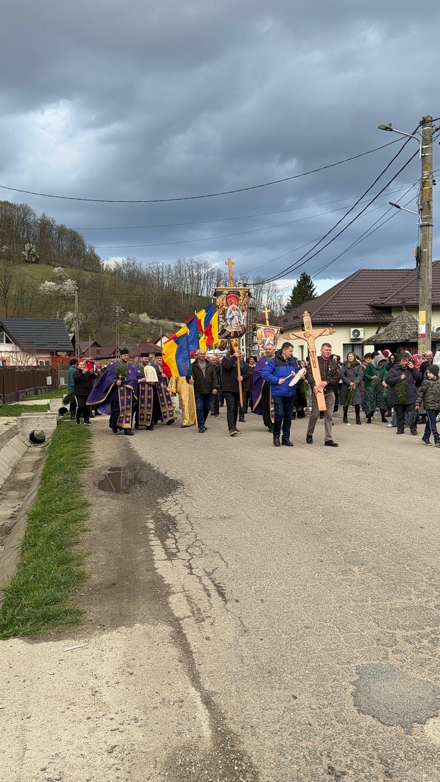 Preoții slujitori Robert Stan și Florin Păcioianu, înconjurați de numeroși credincioși au pornit cu ramuri de finic în mână și cântări bisericești, pornind de la o troiță reprezentativă a comunității către biserica parohială, unde au săvârșit slujba de seară.