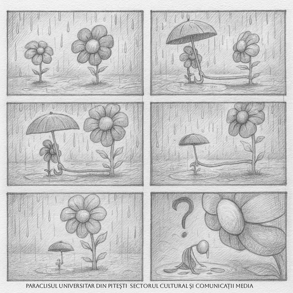 O imagine sugestivă ne arată două flori sub ploaie: una ține umbrela ca să-și apere „semenul” de picături. Cel protejat nu crește din lipsa apei, dar protectorul, expus ploii, se dezvoltă. La final, floarea hiperprotejată rămâne ofilită și risipită de vânt.