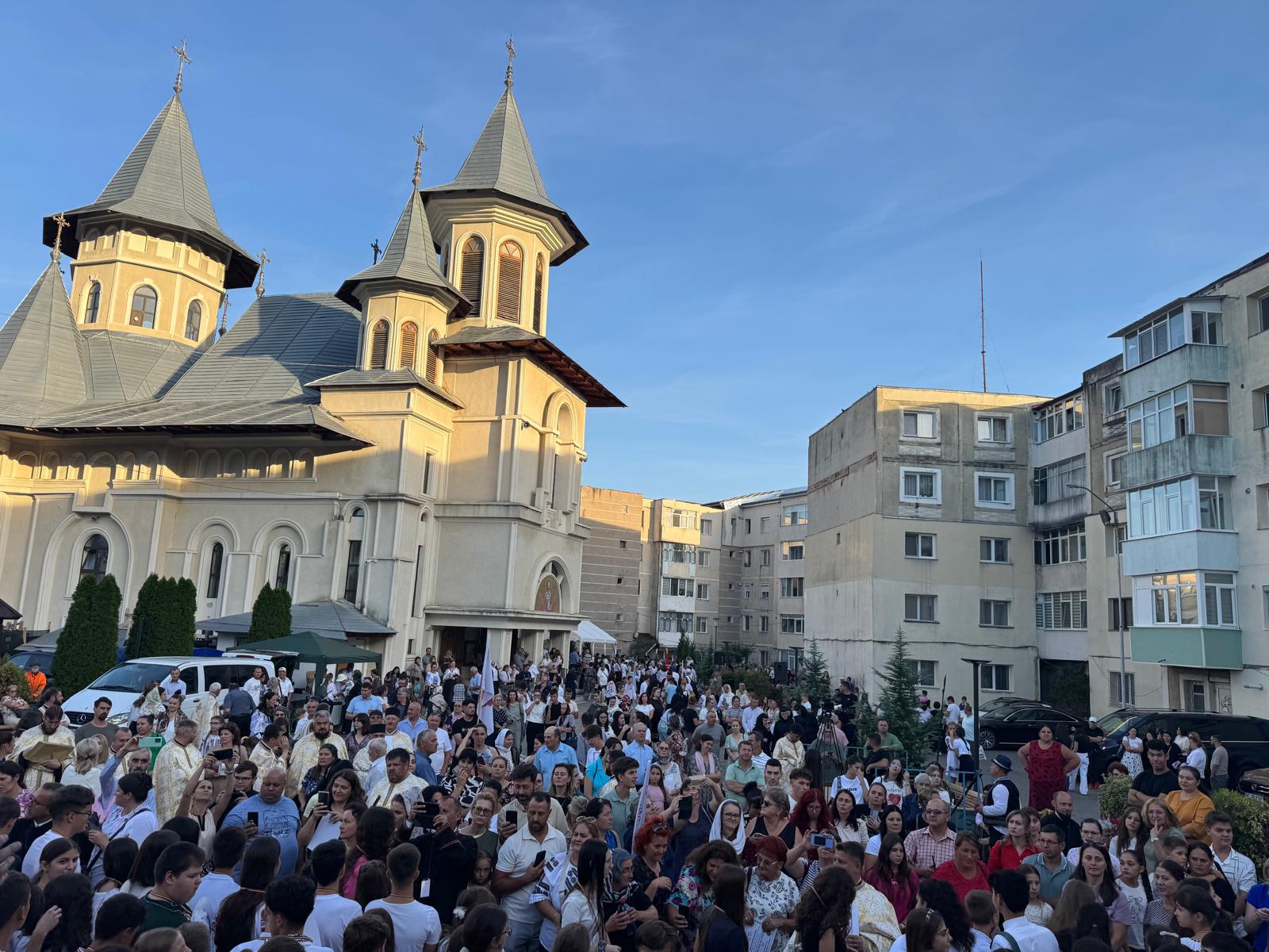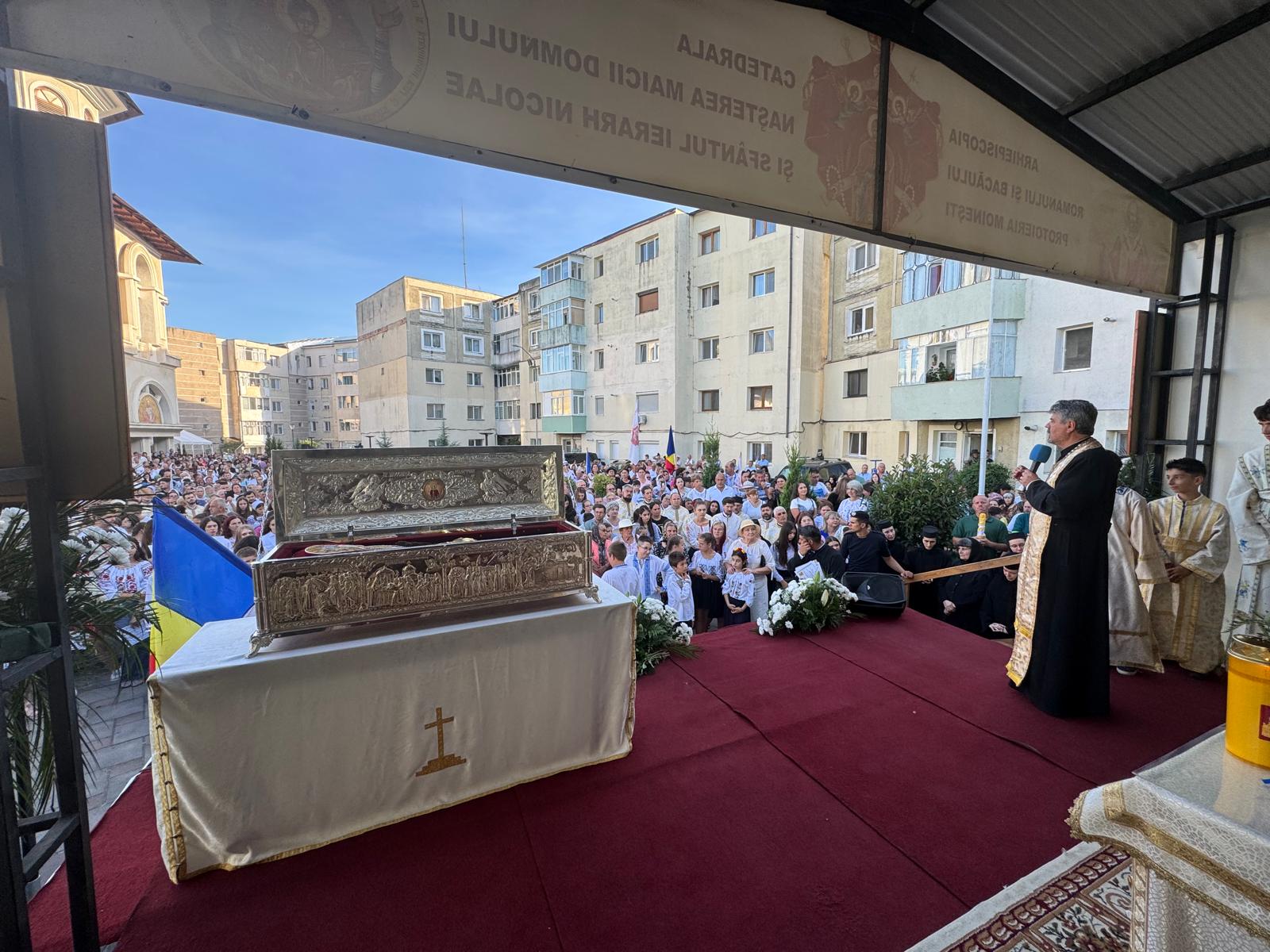 Delegația argeșeană a fost întâmpinată de către Preasfințitul Teofil Trotușanul, episcop vicar al Arhiepiscopiei Romanului și Bacăului, de părintele protoiereu Costel Mareș și de mulțime mare de clerici și credinciosi.