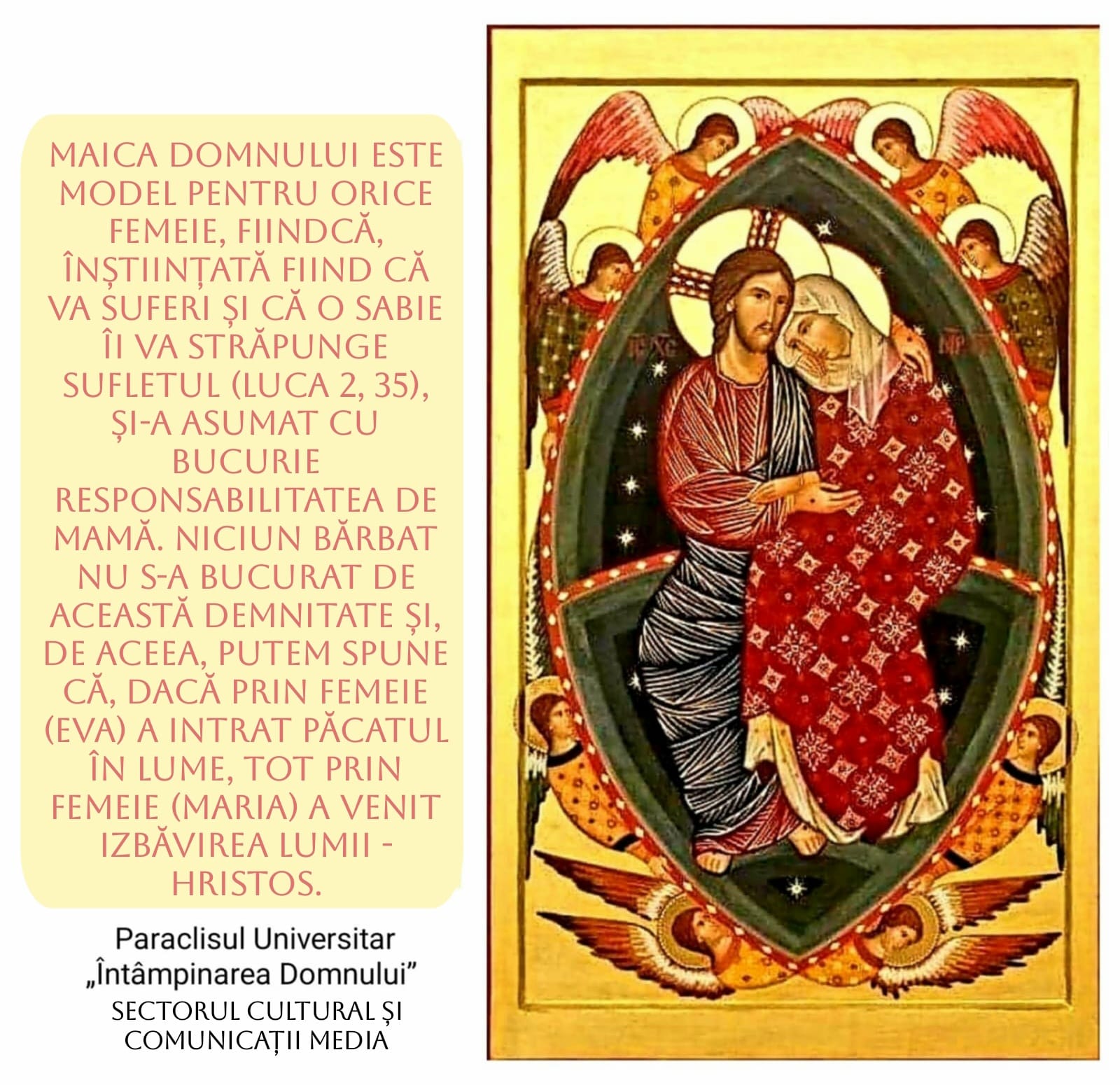 Maica Domnului a rostit puține cuvinte în Evanghelii, dar a lăsat un testament esențial: „Faceți orice vă va spune El” (Ioan 2, 5). Acesta este cuvântul Maicii: trimitere smerită spre Hristos. În majoritatea icoanelor ortodoxe, o vedem pe Maica Domnului ținându-L în brațe pe Hristos și arătând spre El, semn că nu ea este centrul, ci El, dar că prin ea ne apropiem de El.