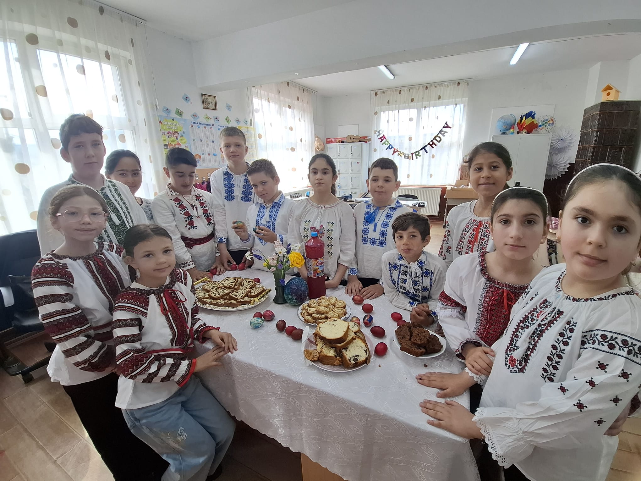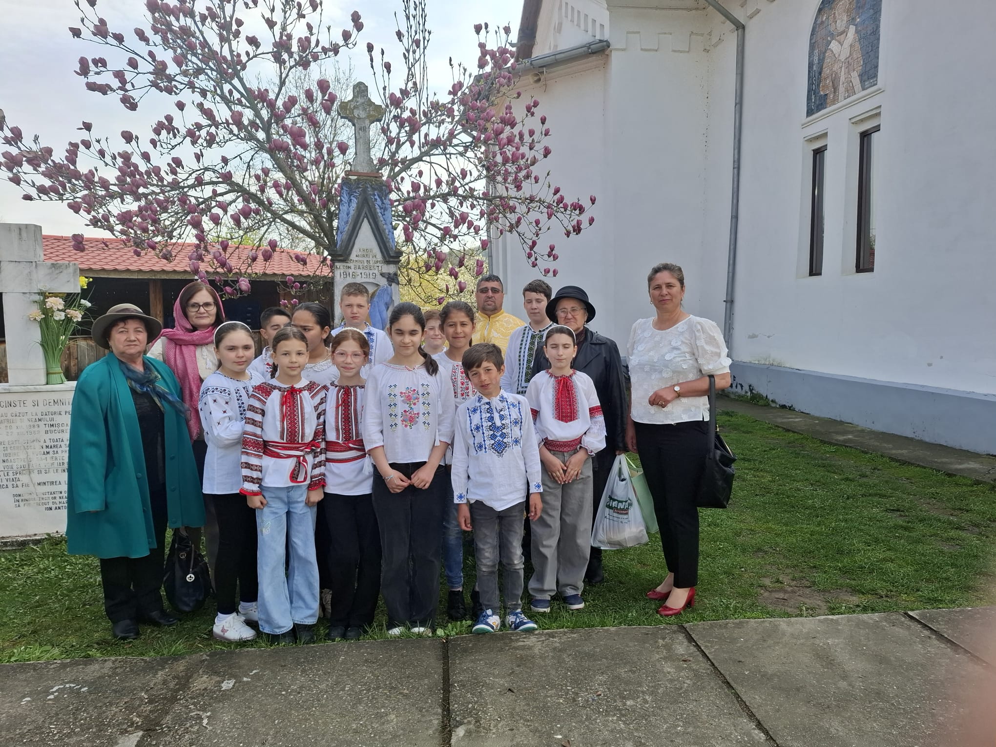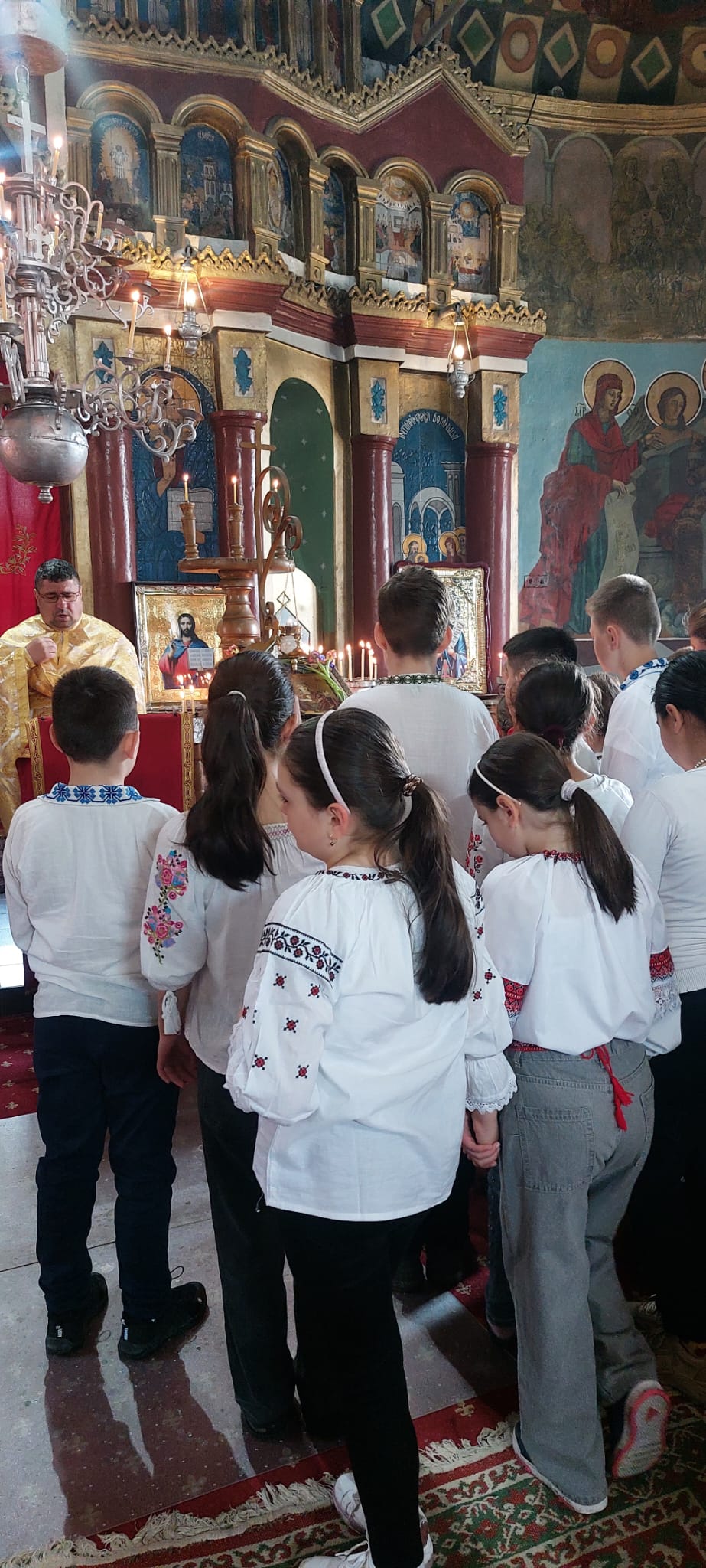 Elevii clasei a III-a B, îndrumați de cadrele didactice: Dumitrescu Emilia Mihaela-directorul școlii, de consilierul educativ Popescu Maria și de Irina Nicolae, au pășit în curtea bisericii îmbrăcați în portul popular românesc. Cămașa albă, cusută cu migală, brâul colorat și motivele tradiționale au transformat grupul de copii într-o adevărată icoană vie a satului românesc, amintind tuturor de rădăcinile adânci ale neamului.