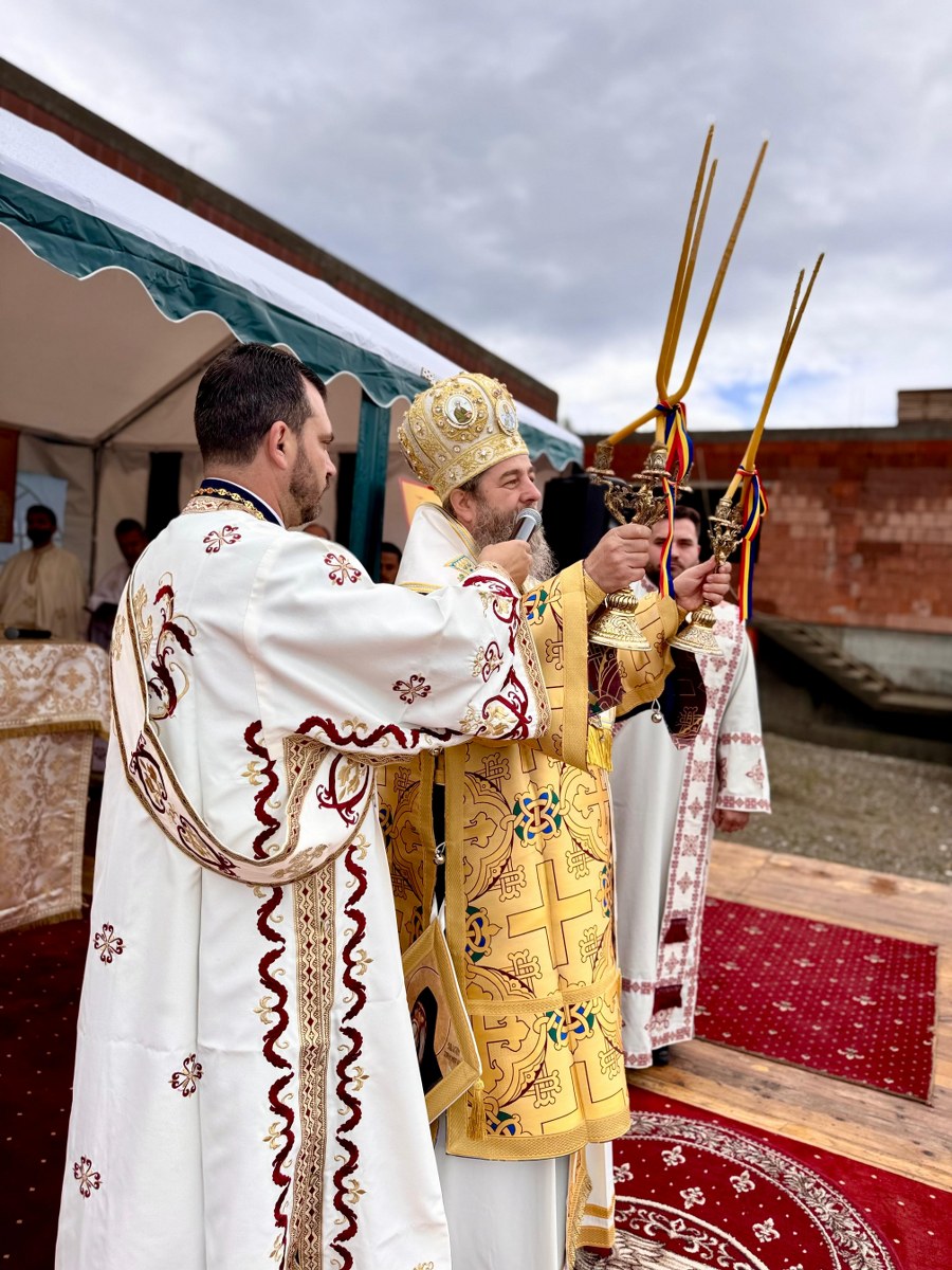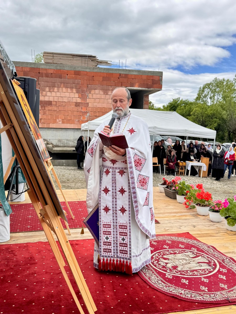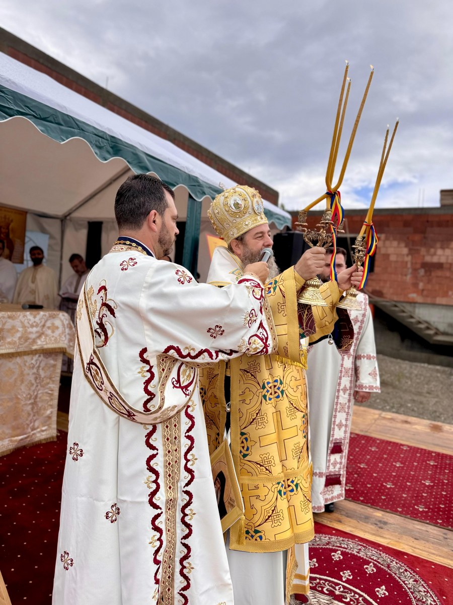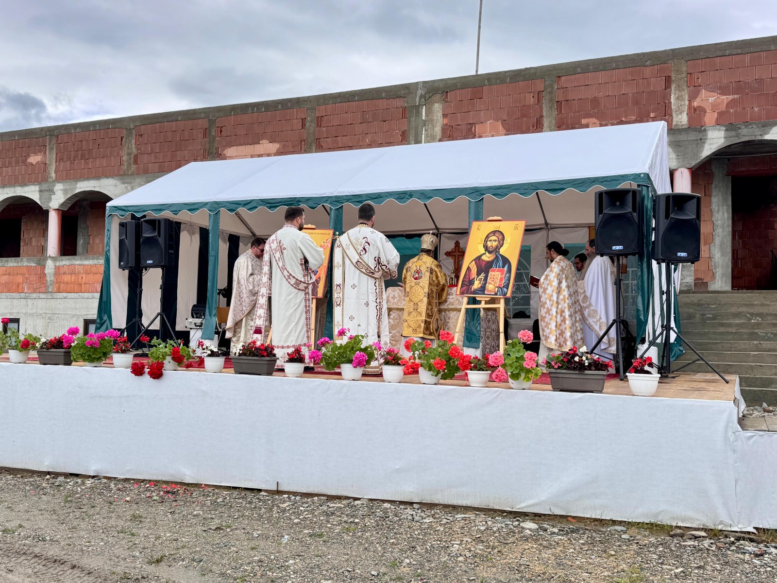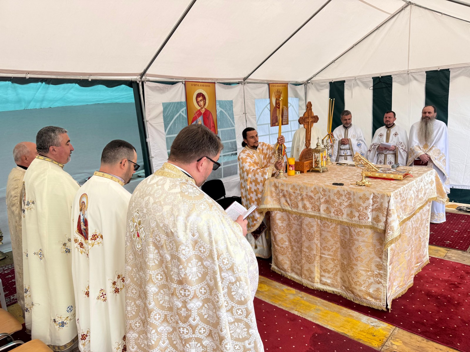Pe o scenă special amenajată lângă locul construcției, Sfânta Liturghie a fost oficiată de Preasfințitul Siluan, Episcop al românilor ortodocși din Ungaria, împreună cu un sobor de preoți și diaconui.