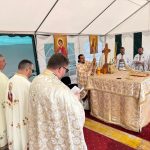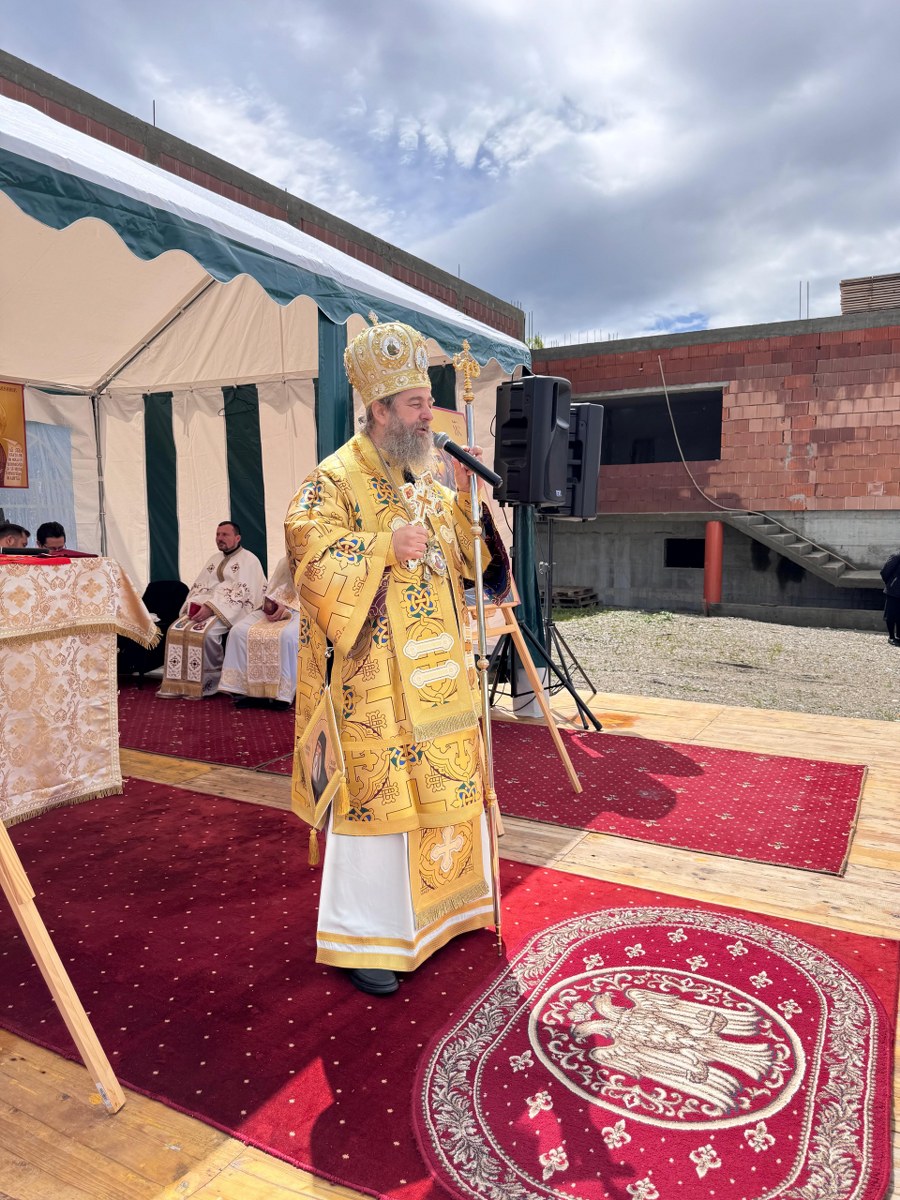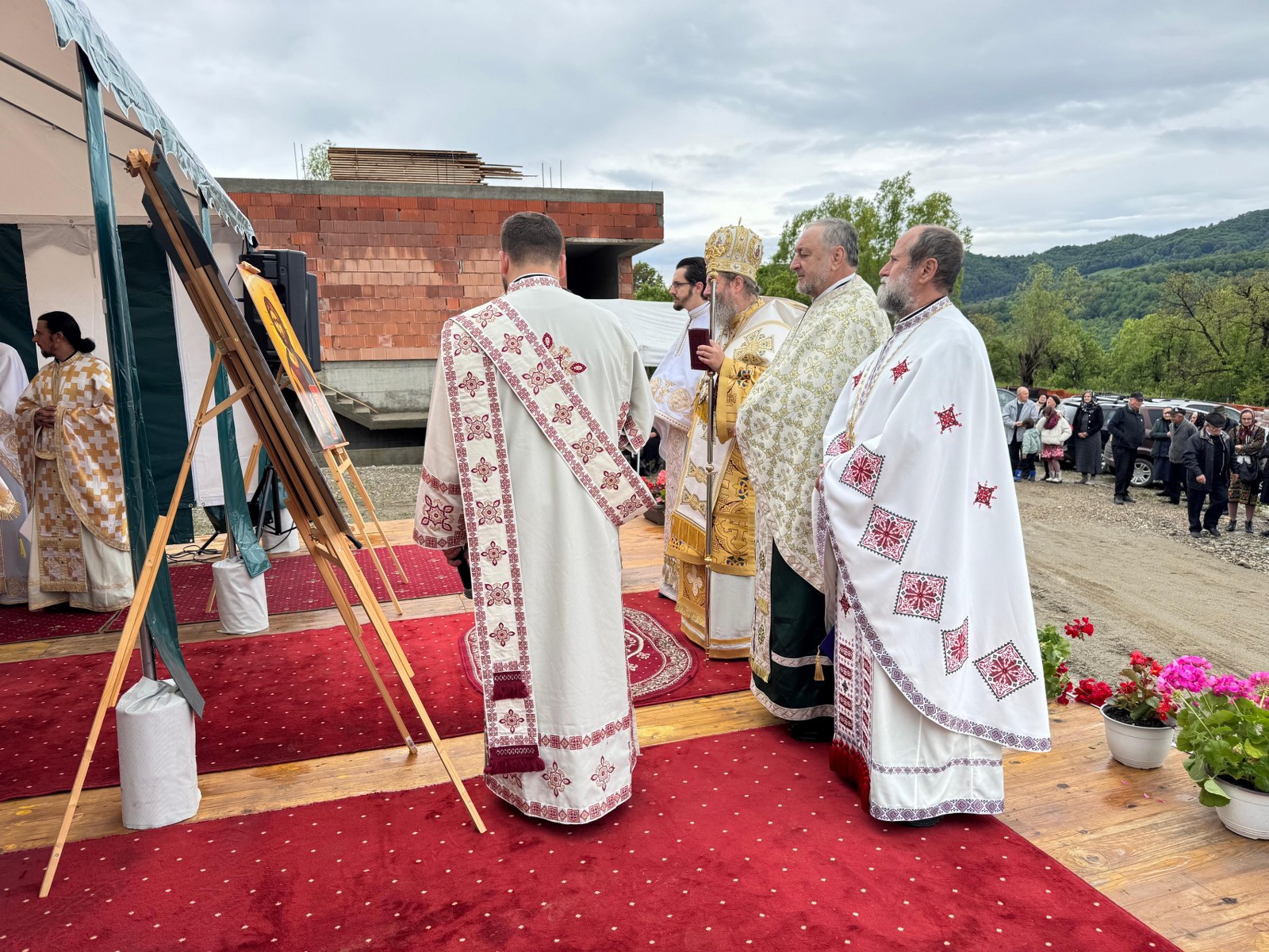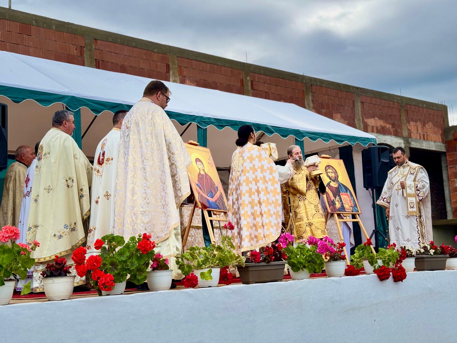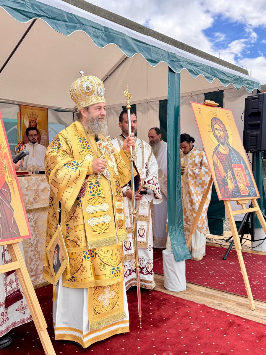Pe o scenă special amenajată lângă locul construcției, Sfânta Liturghie a fost oficiată de Preasfințitul Siluan, Episcop al românilor ortodocși din Ungaria, împreună cu un sobor de preoți și diaconui.