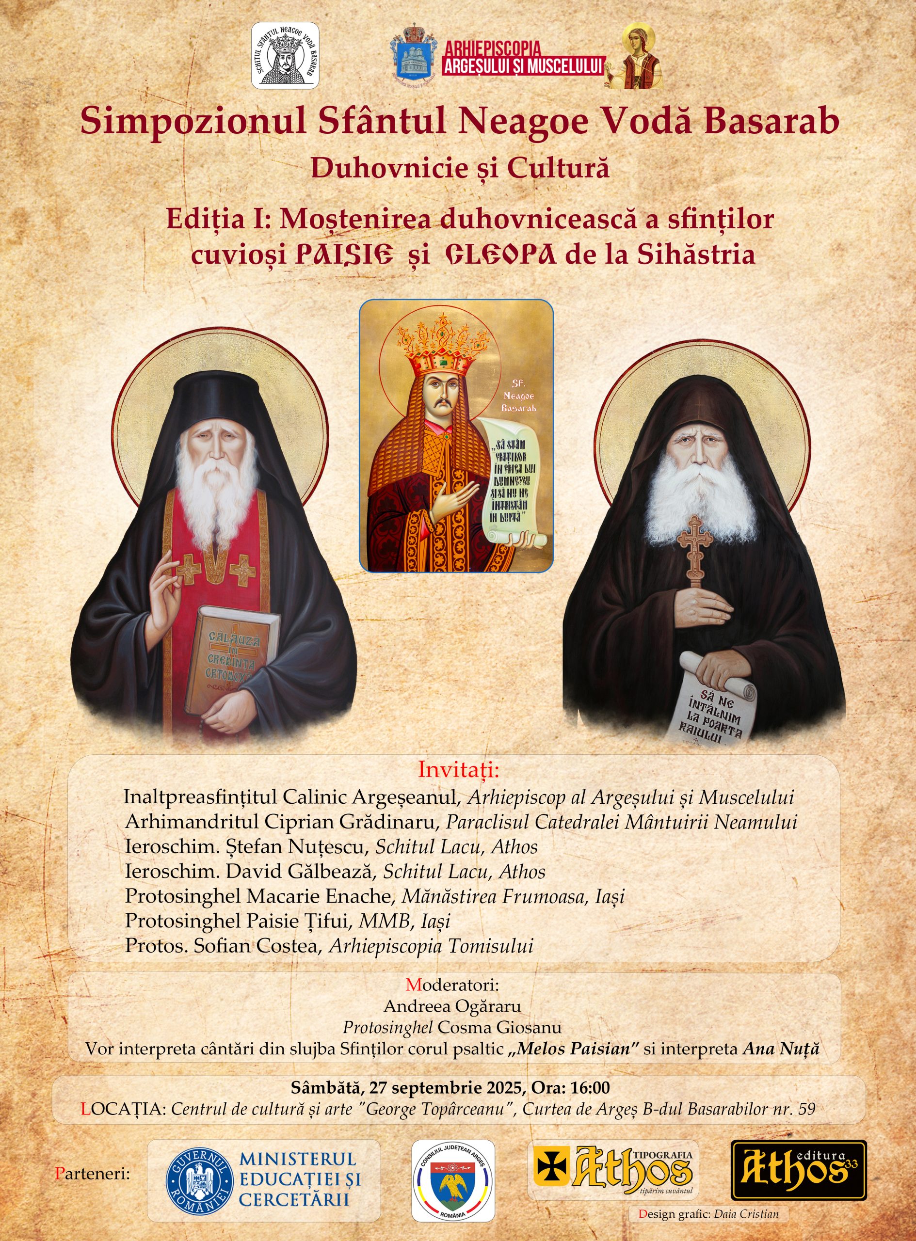 Cu binecuvântarea Înaltpreasfințitului Părinte Calinic Argeșeanul, Arhiepiscopia Argeșului și Muscelului prin Schitul Sfântul Neagoe Vodă Basarab – Vlădești, organizează sâmbătă, 27 septembrie, ora 16.00, la Centrul de Cultură și Arte „George Topârceanu” din Curtea de Argeș: SIMPOZIONUL SFÂNTUL NEAGOE VODĂ BASARAB, Ediția I: Moștenirea duhovnicească a sfinților cuvioși PAISIE și CLEOPA de la Sihăstria!
