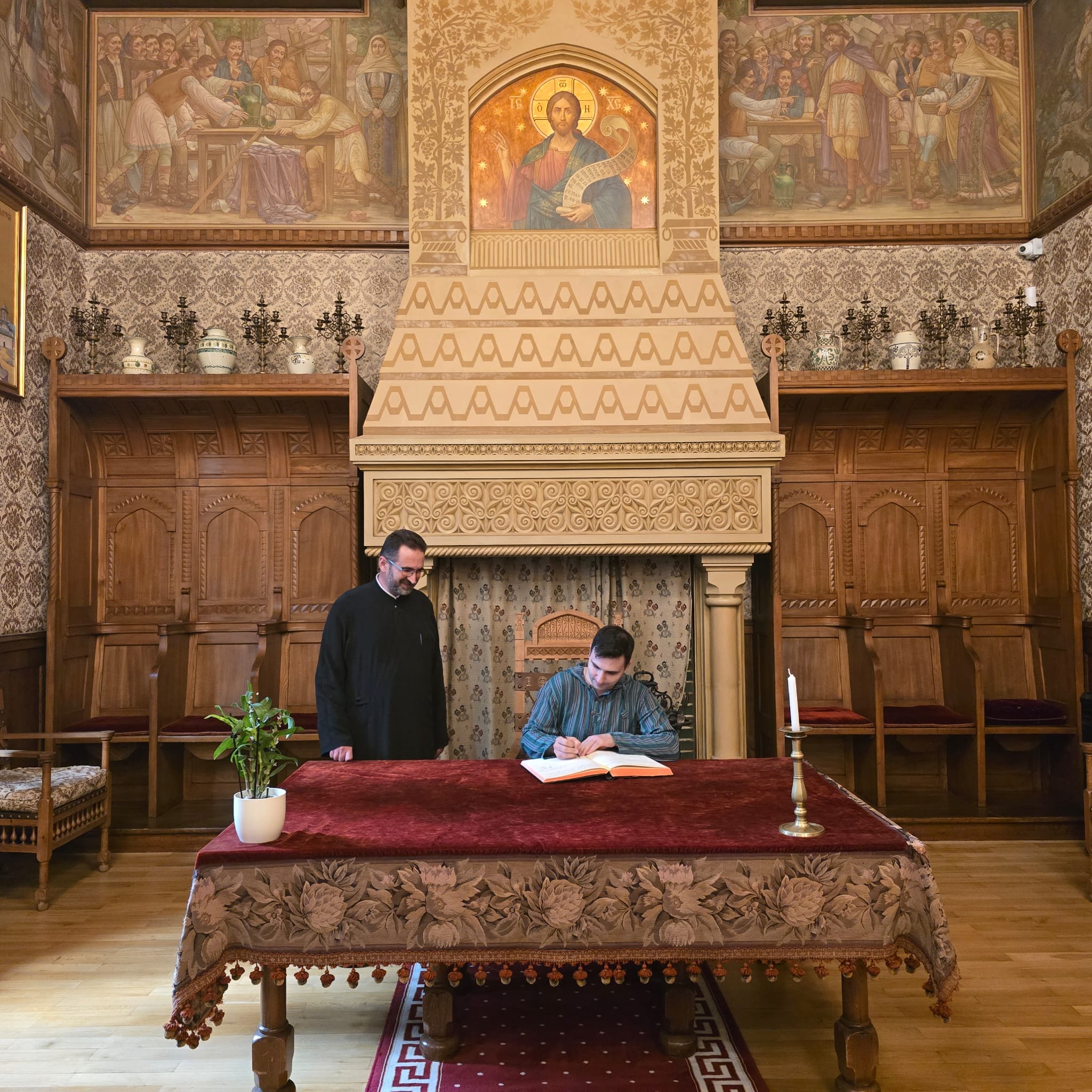 Ghidat de părintele Enache Adrian și însoțit de părintele prof. Rafael Vintilă, consilier filosofic și analitic, distinsul oaspete a avut ocazia de a admira valoroase obiecte de patrimoniu, care dau mărturie despre continuitatea, rafinamentul și profunzimea tradiției ortodoxe și regale românești.