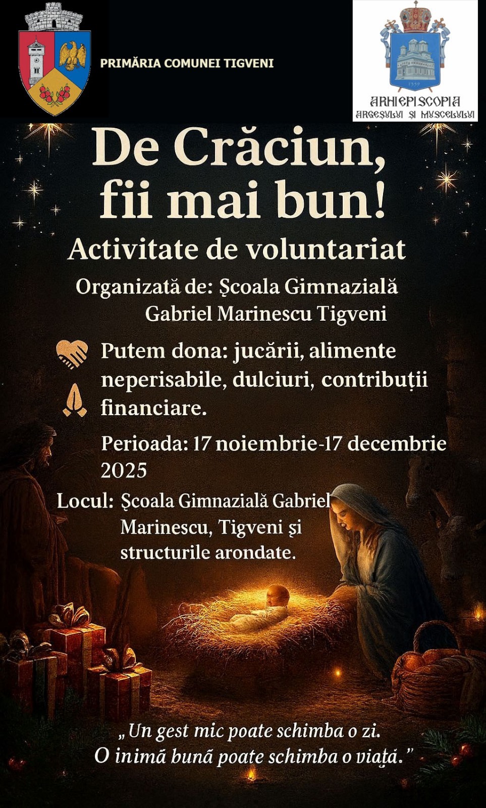 Sub titlul „De Crăciun… fii mai bun!”, proiectul de voluntariat și incluziune socială, desfășurat între 17 noiembrie și 17 decembrie 2025, a reunit elevi, cadre didactice, colaboratori și invitați într-un demers amplu de responsabilizare socială, spirituală și emoțională.