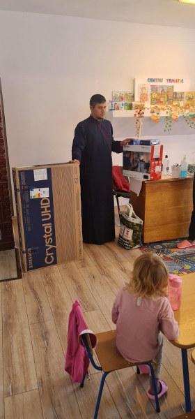 Părintele slujitor Bologea Cosmin Vasile de la parohia Turculești, protoieria Topoloveni, a fost în mijlocul copiilor de la Grădinița din Beleți Negrești, cărora le-a oferit un televizor, o imprimantă și iconițe.